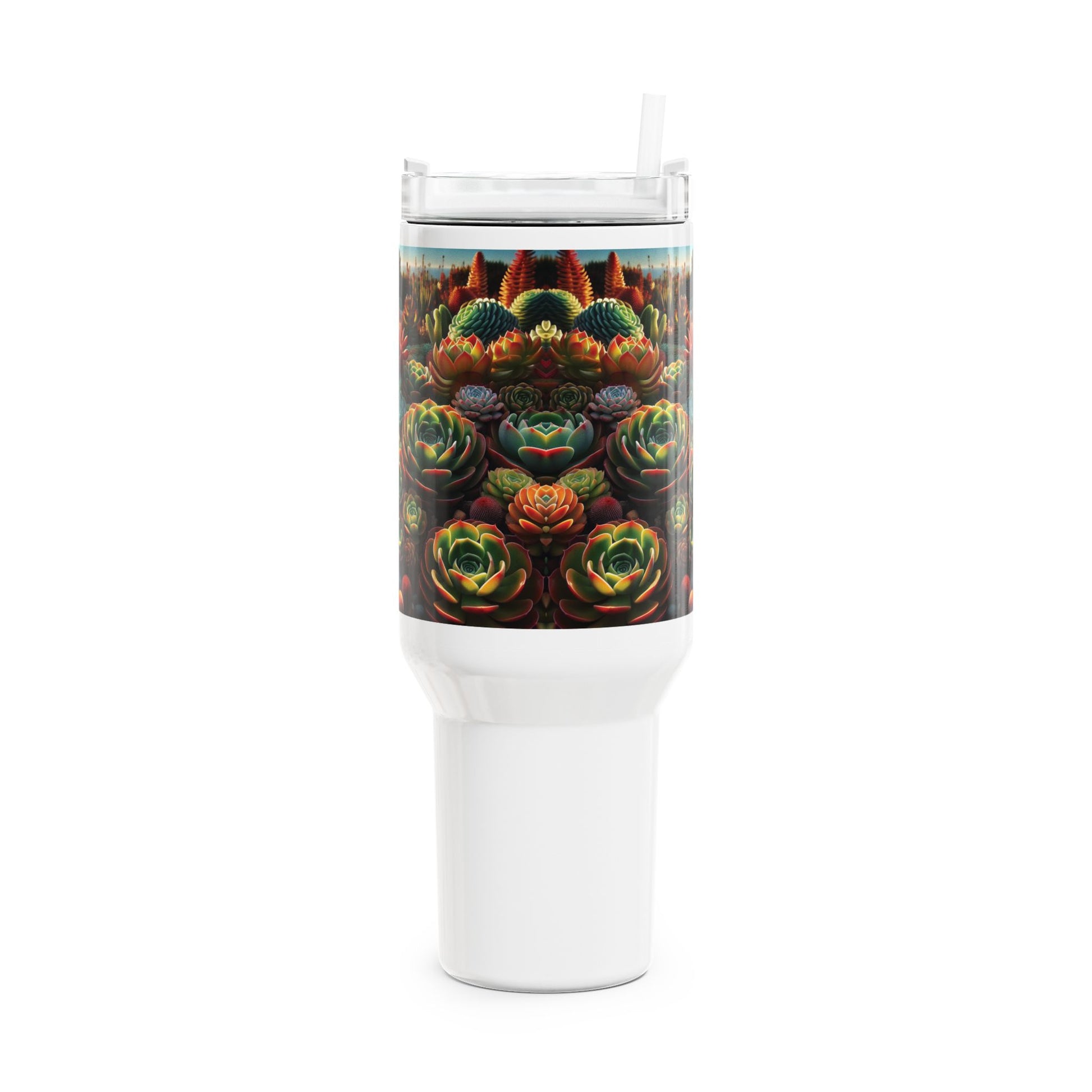 Stay hydrated in style with this 40oz tumbler featuring a design of desert succulents. Perfect for keeping your drinks hot or cold for hours, this tumbler is ideal for daily use or outdoor adventures. It's a great gift for nature lovers and those who appreciate vibrant desert landscapes. Suitable for everyday use, birthdays, or housewarming gifts.