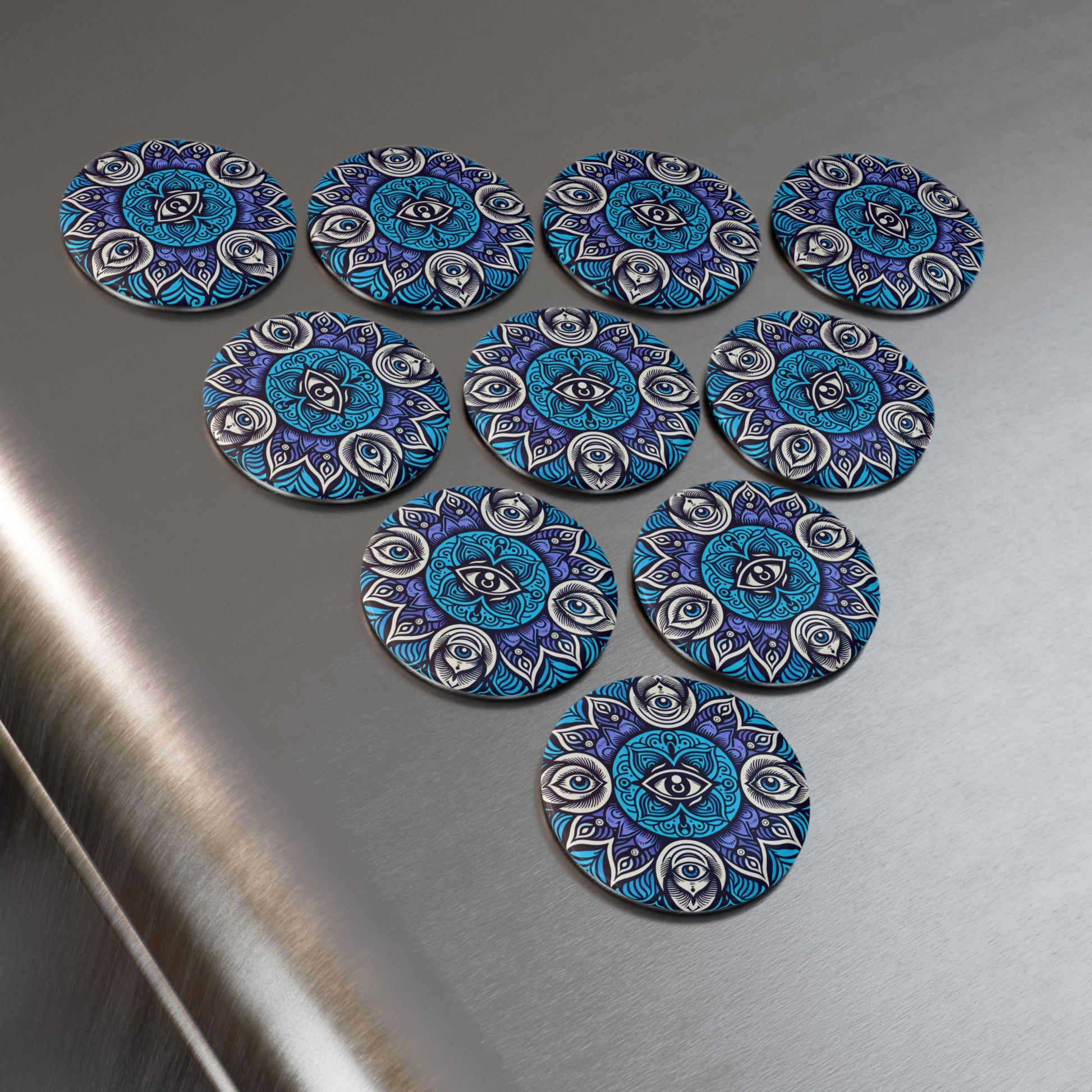 This third eye chakra magnet features vibrant colors and a round shape, providing a mystical and spiritual vibe. Perfect for those interested in chakras and energy healing, this magnet can be a great addition to a refrigerator or magnetic surface. Ideal for spiritual enthusiasts and those celebrating mindfulness and meditation practices.