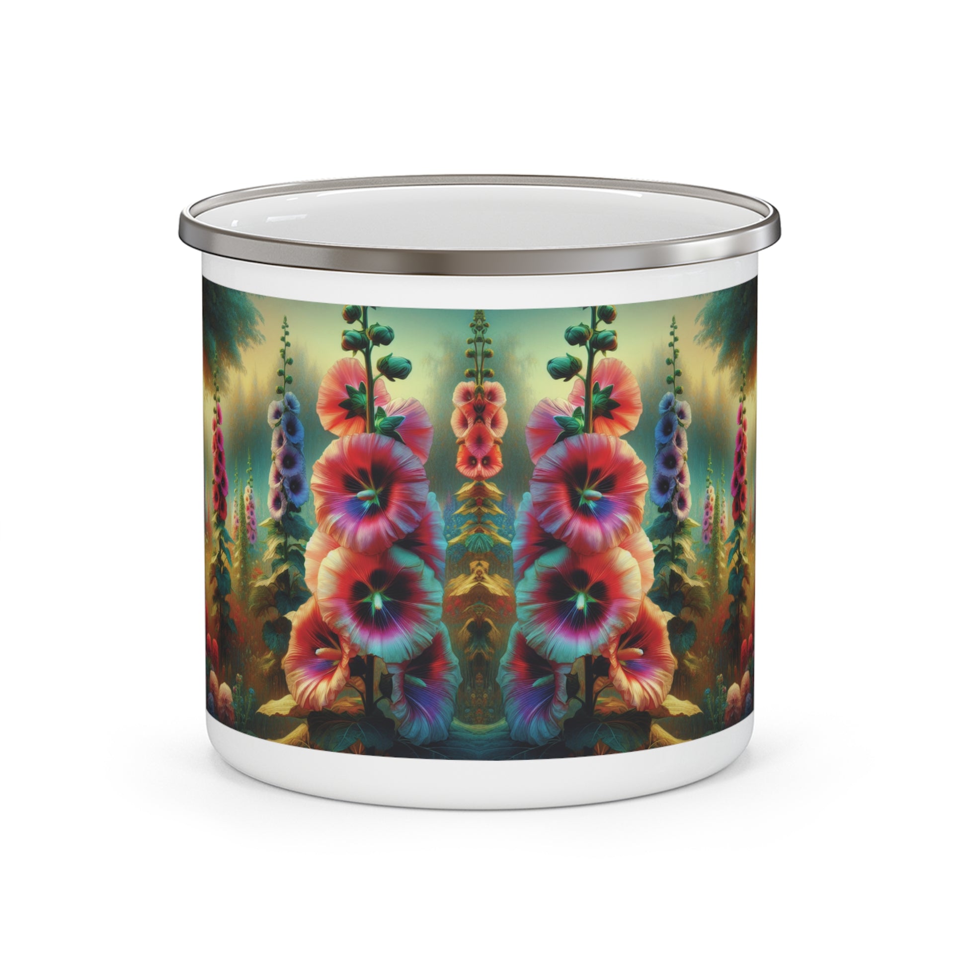 This hollyhocks designed enamel camping mug evokes a sense of outdoor adventure and nature. Perfect for camping trips, hiking excursions, or simply enjoying a cozy morning in your backyard. Ideal for nature enthusiasts, hikers, campers, and outdoor lovers. Relevant for camping trips, nature walks, Earth Day, and outdoor celebrations.