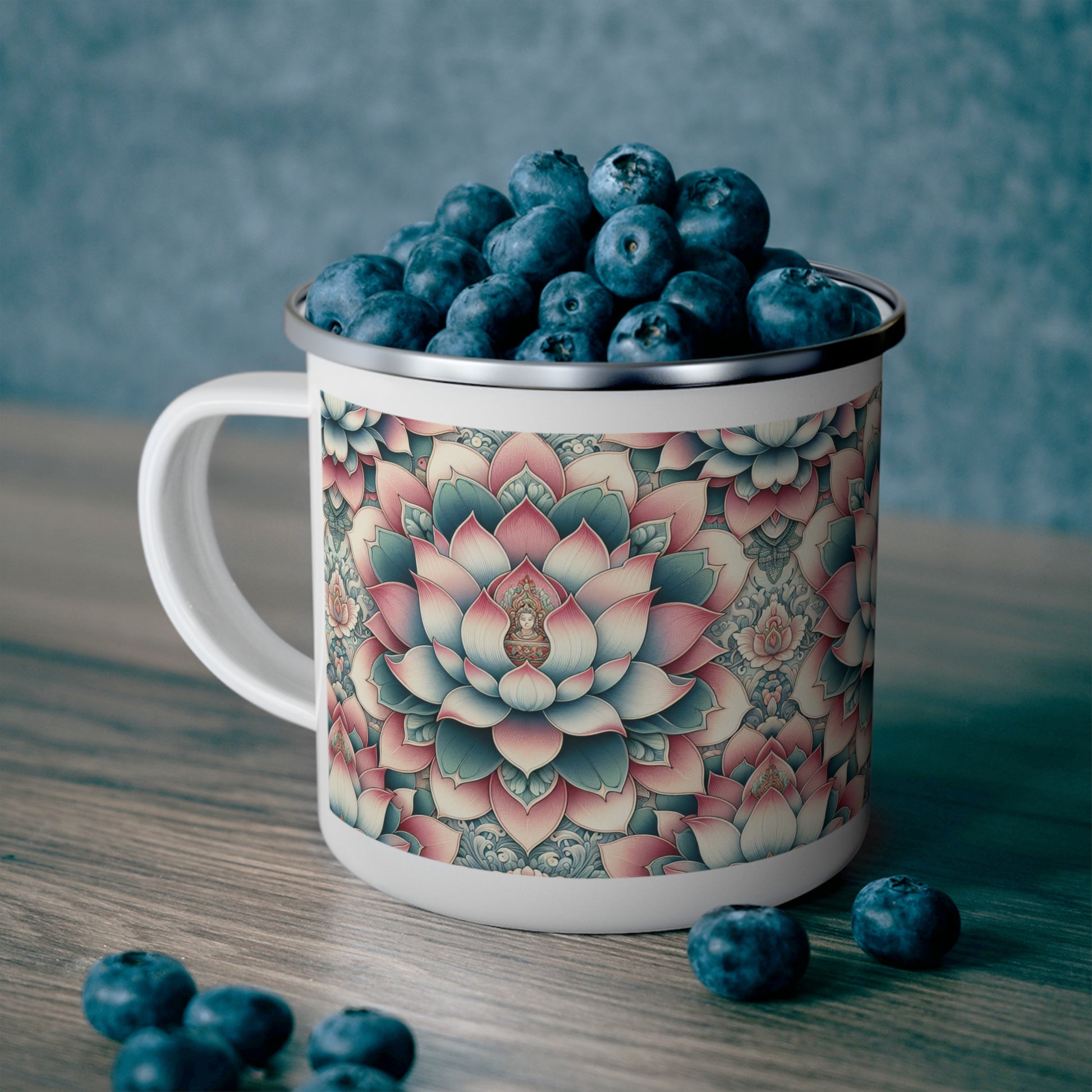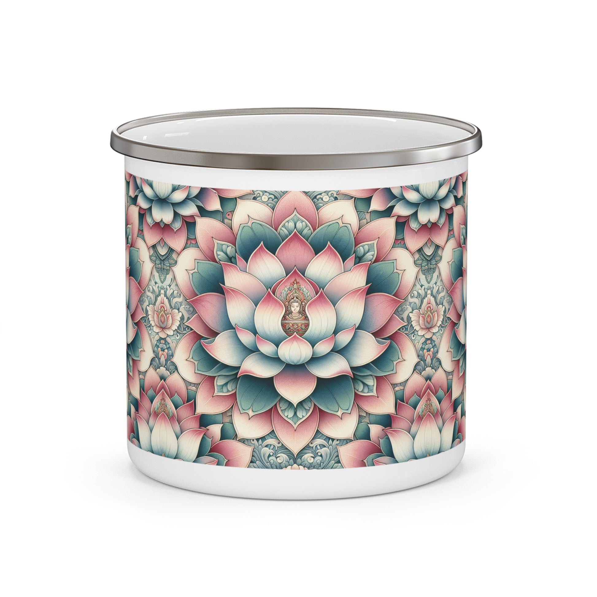 A stainless steel enamel camping mug featuring a beautiful lotus flower design. Perfect for nature lovers and outdoor enthusiasts. Great for camping trips, hiking adventures, or simply enjoying your morning coffee in the backyard.