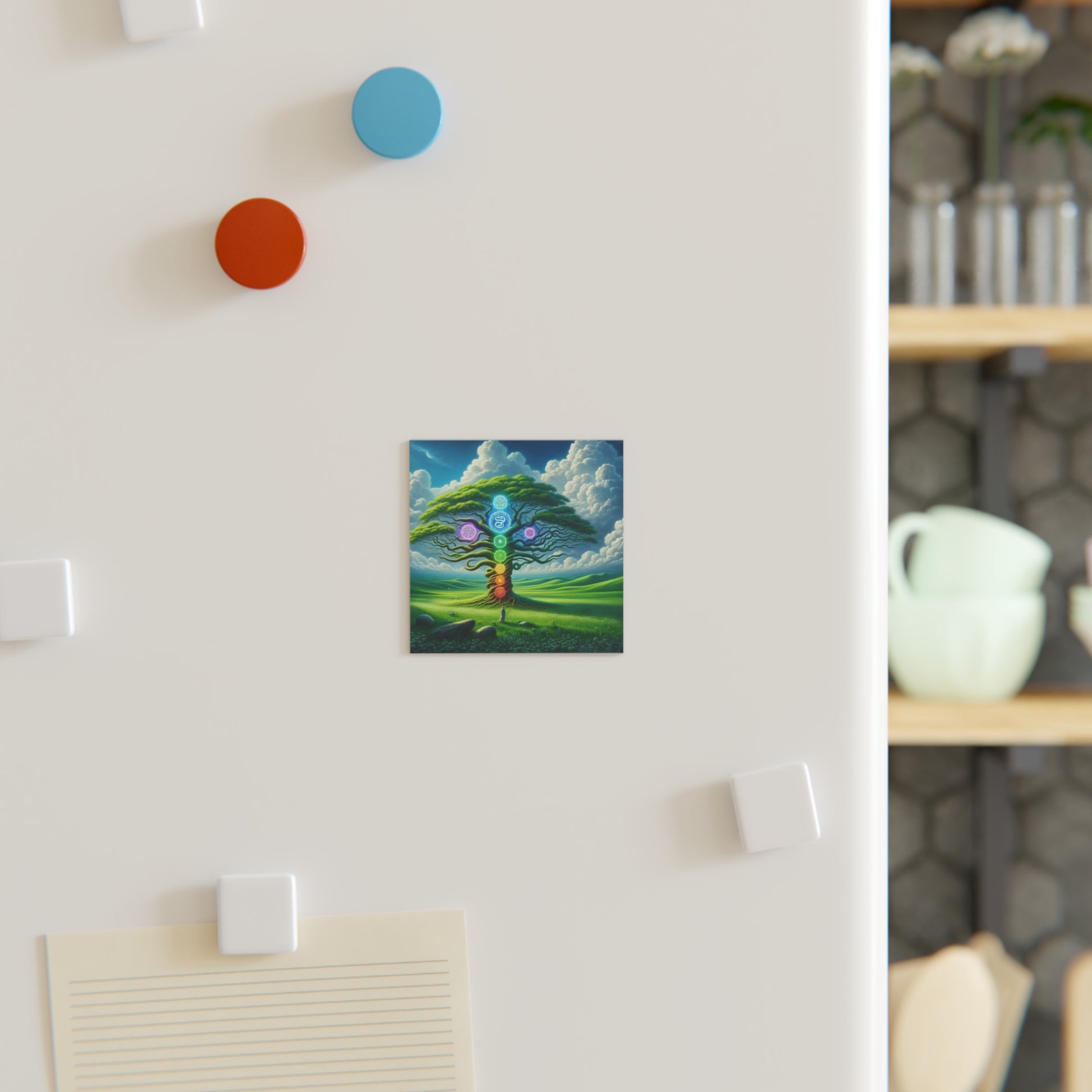 A Square Magnet featuring a beautiful chakra tree design, perfect for adding a touch of spirituality and tranquility wherever you place it. Ideal for those who appreciate holistic healing practices and nature-inspired decor. Relevant for meditation spaces, yoga studios, or as a thoughtful gift for someone interested in energy centers.