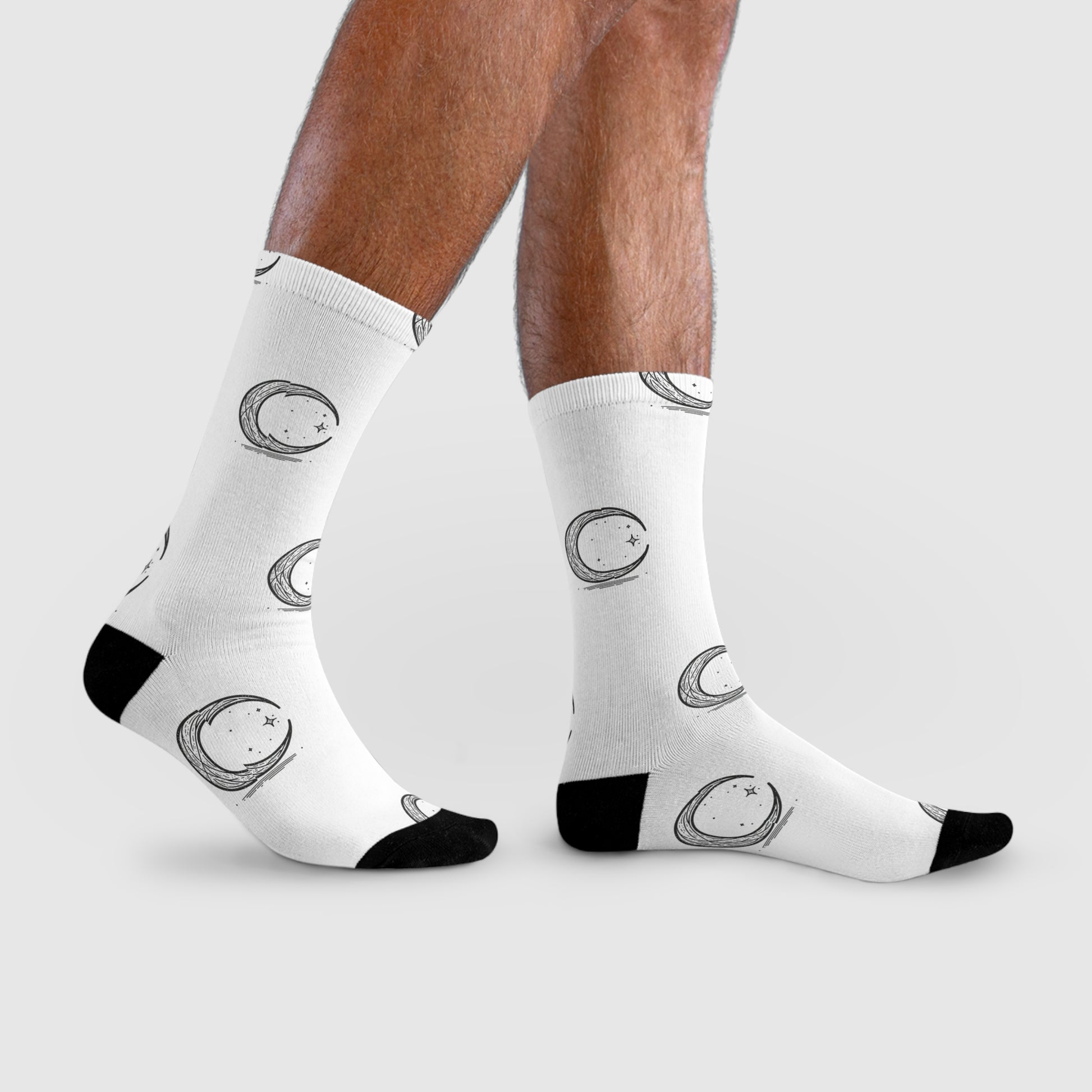 Crescent Moon Crew Socks, Minimalist Lunar Design, Night Sky Apparel, Black White Patterned Footwear, Gift for Moon Lovers,