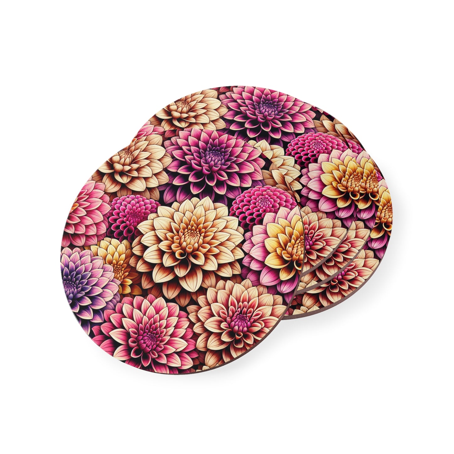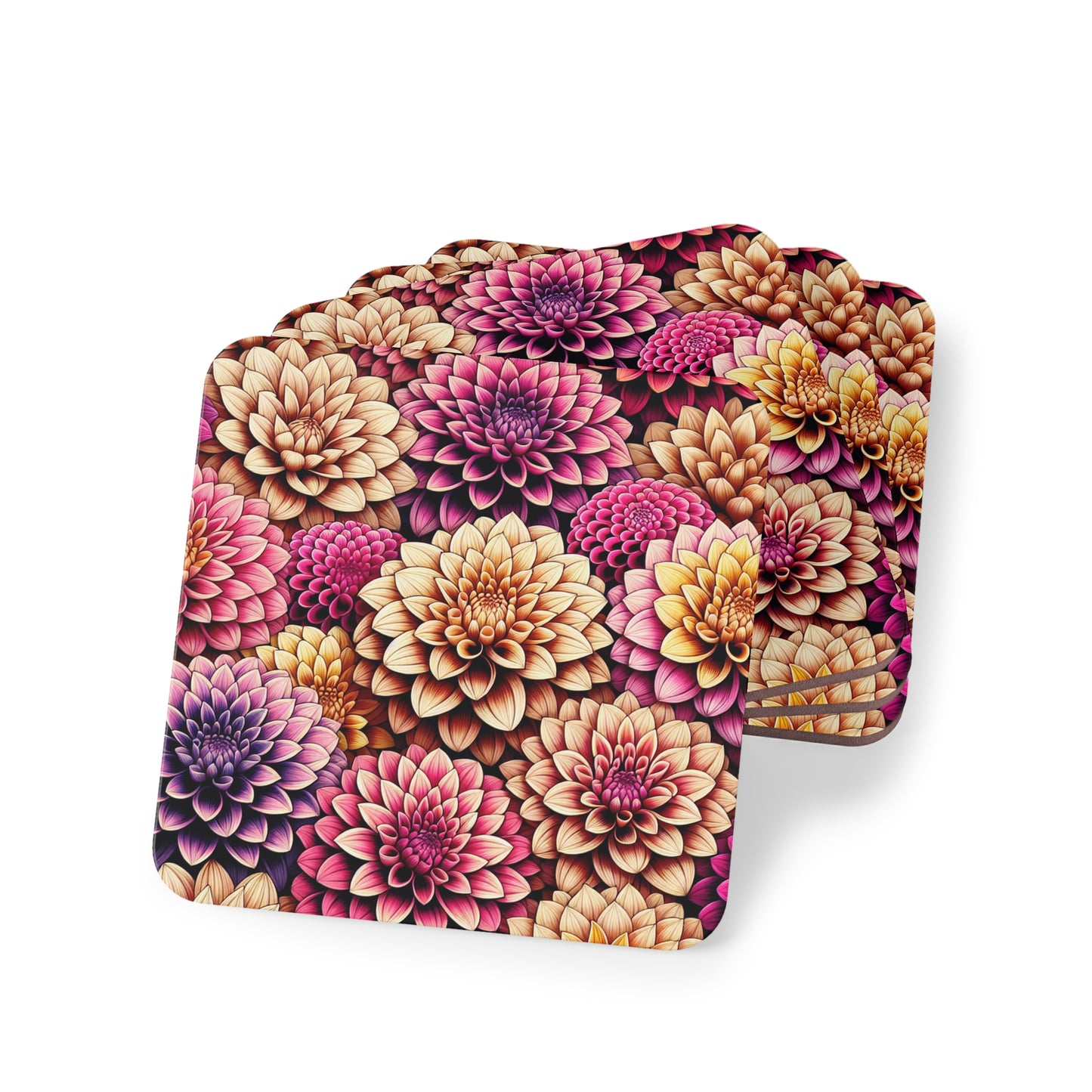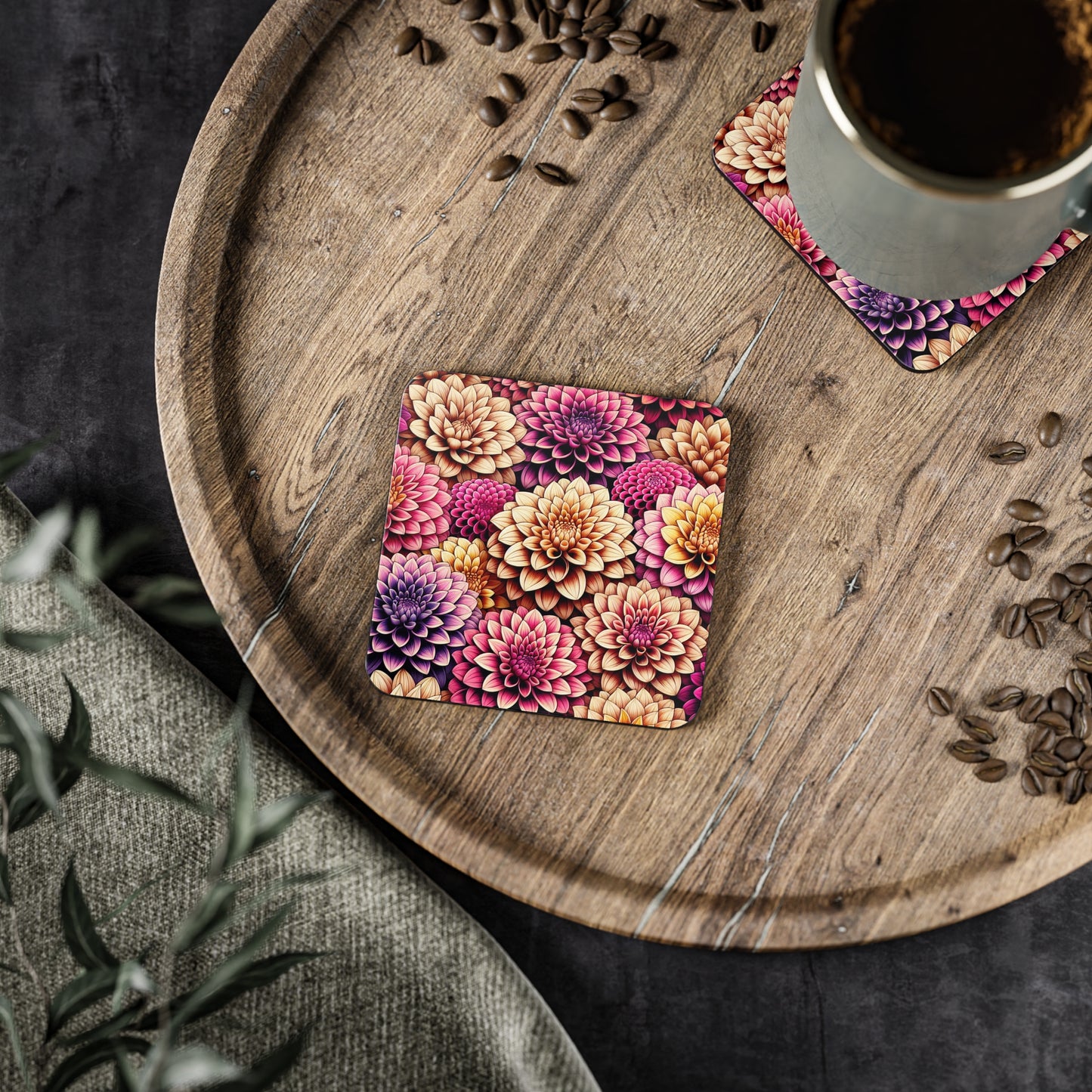 Vibrant and colorful coasters featuring beautiful dahlia blooms. Perfect for adding a touch of nature and elegance to your home decor. Ideal for those who appreciate floral designs and love to entertain guests. Great for housewarming parties, birthdays, or any special occasion.