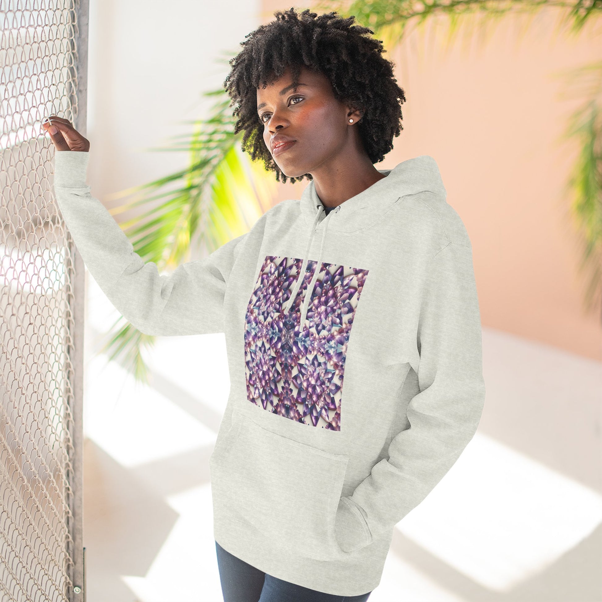 A cozy Three-Panel Fleece Hoodie featuring an amethyst crystal floral design, giving off a mystical and calming vibe. Perfect for those who love nature-inspired motifs and want to stay warm and stylish during colder seasons. Ideal for crystal enthusiasts, nature lovers, and those who appreciate unique designs. Great for gifting during birthdays, holidays, or special occasions.