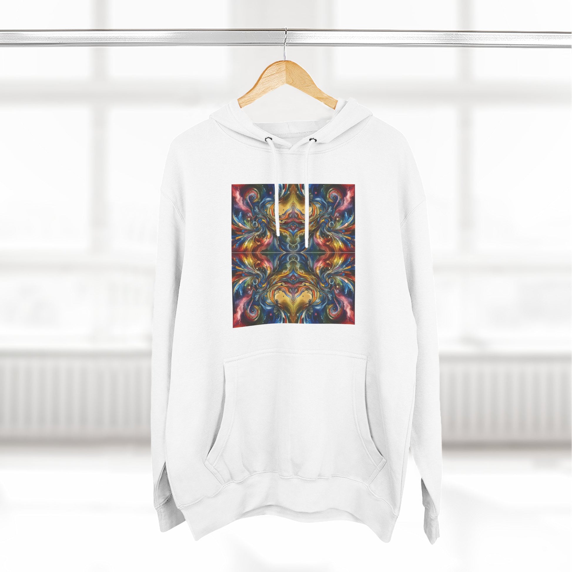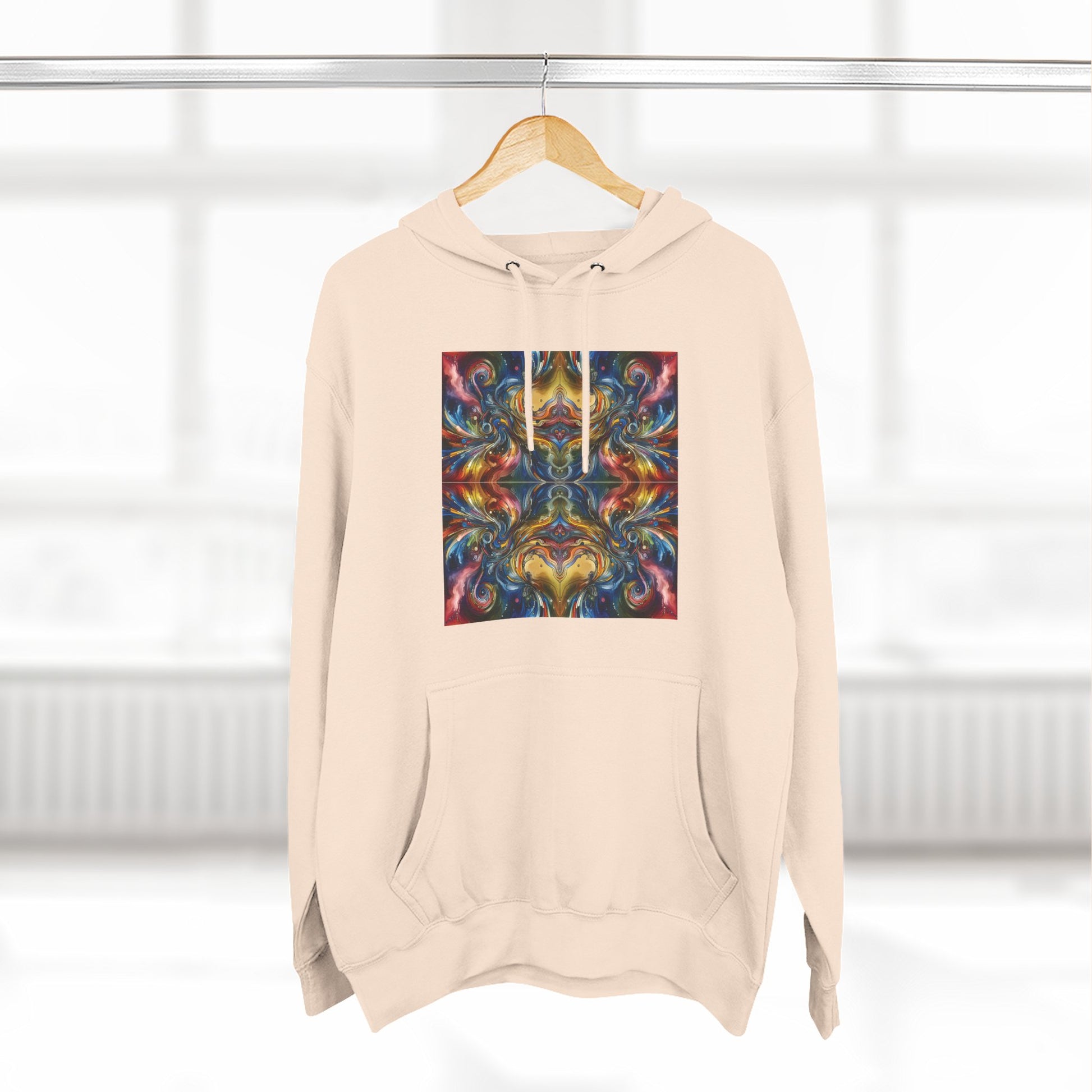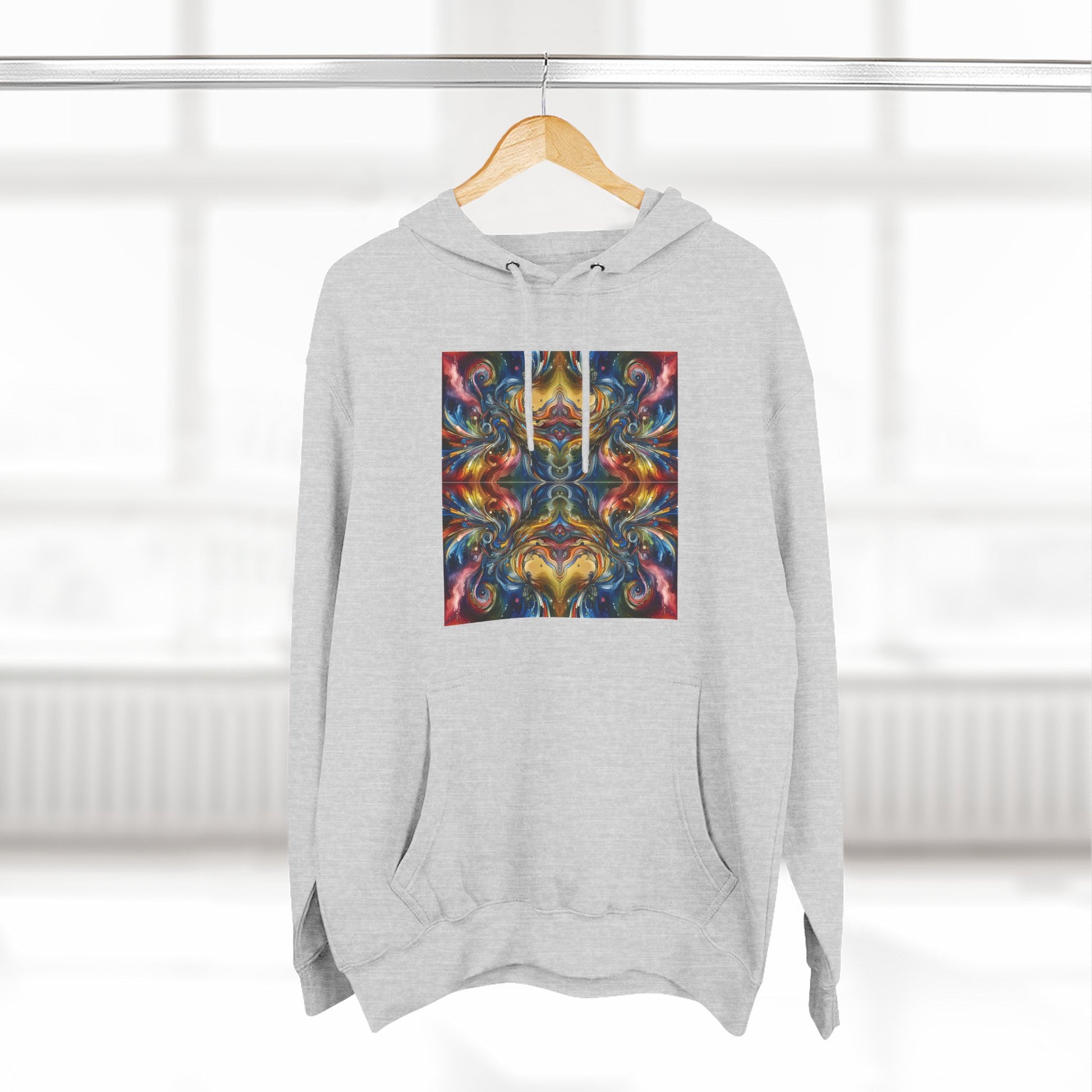 A Three-Panel Fleece Hoodie featuring a design of energy waves. This hoodie provides a cozy and warm feeling, perfect for casual everyday wear or lounging at home. Ideal for those who enjoy unique and vibrant designs. Relevant for holidays, casual gatherings, and weekend outings.