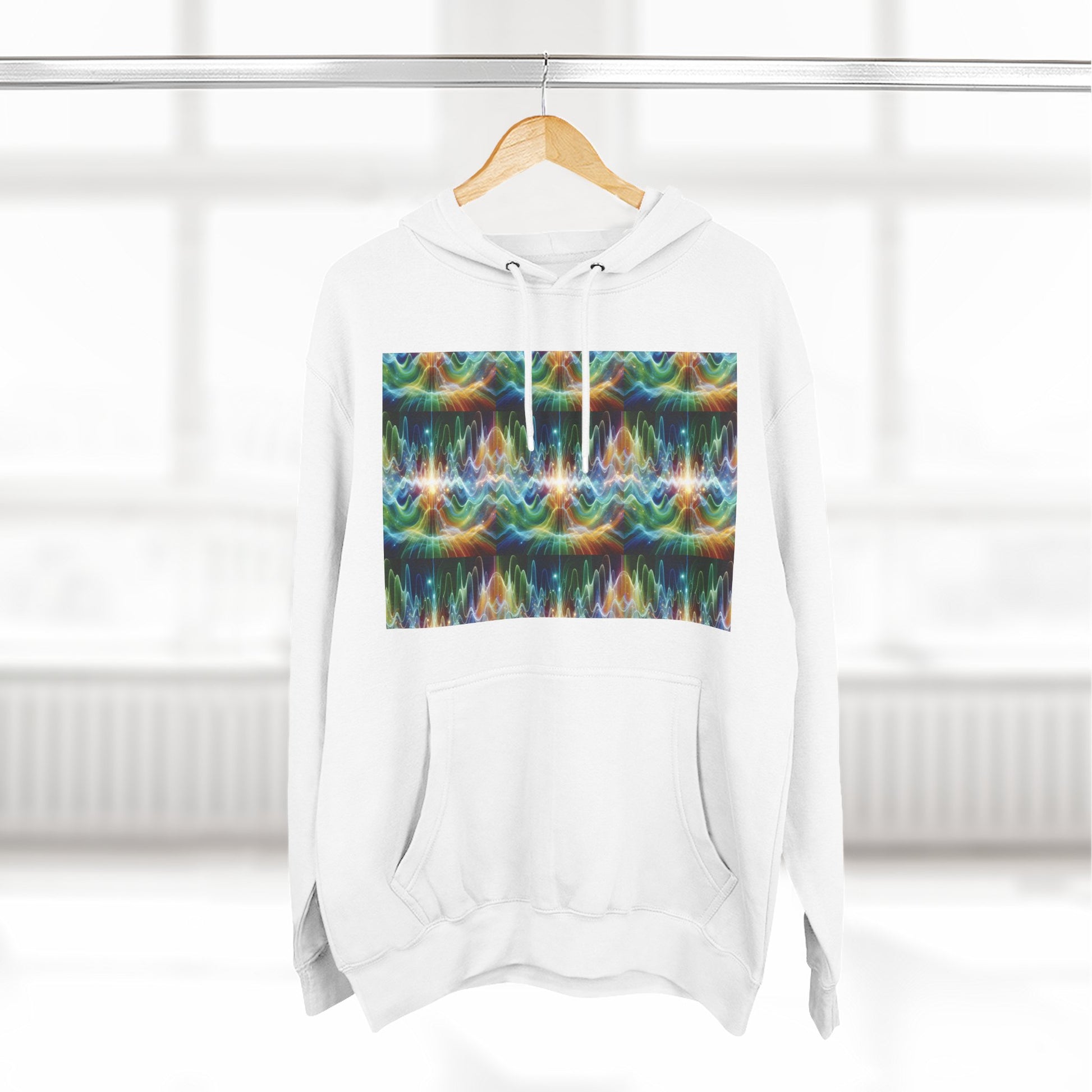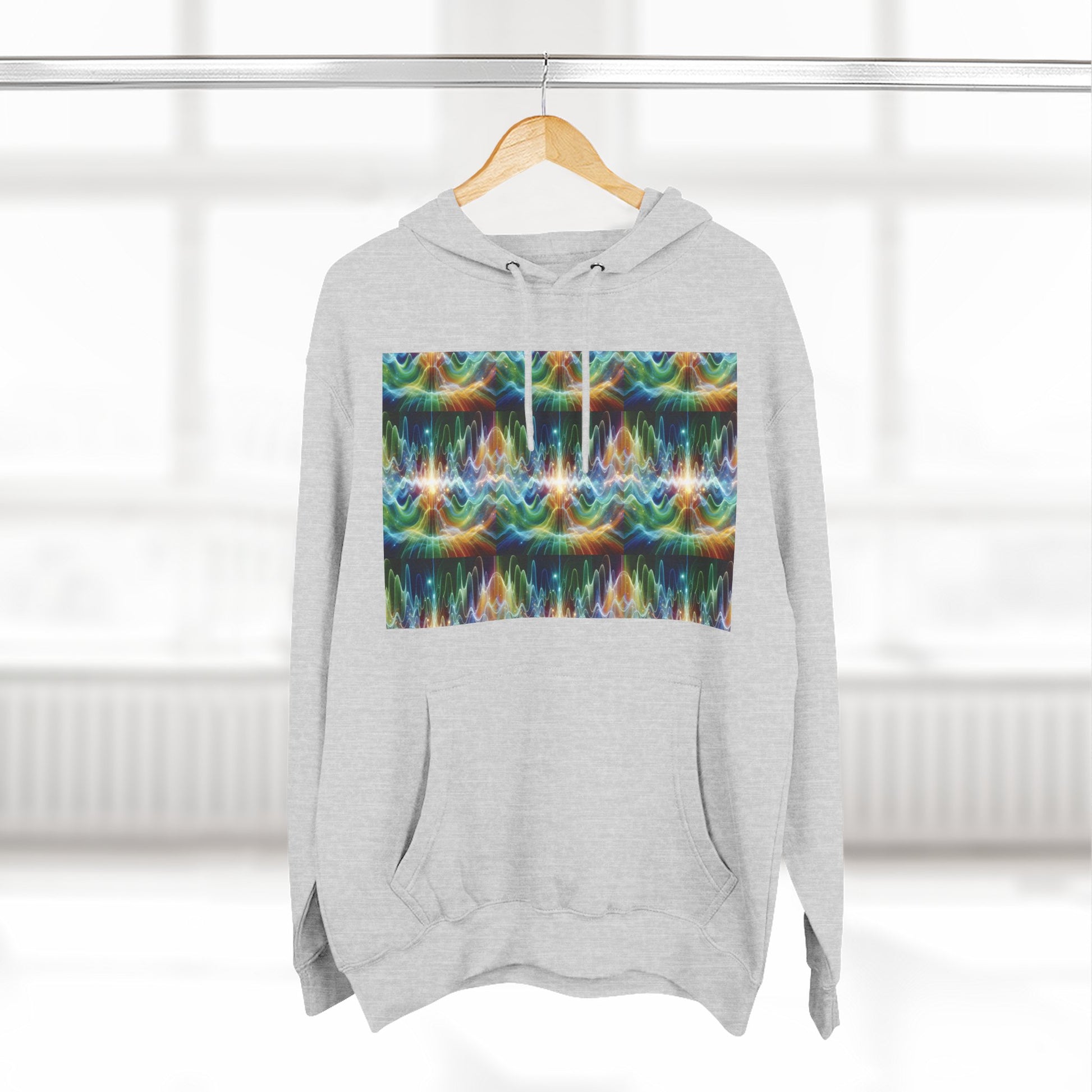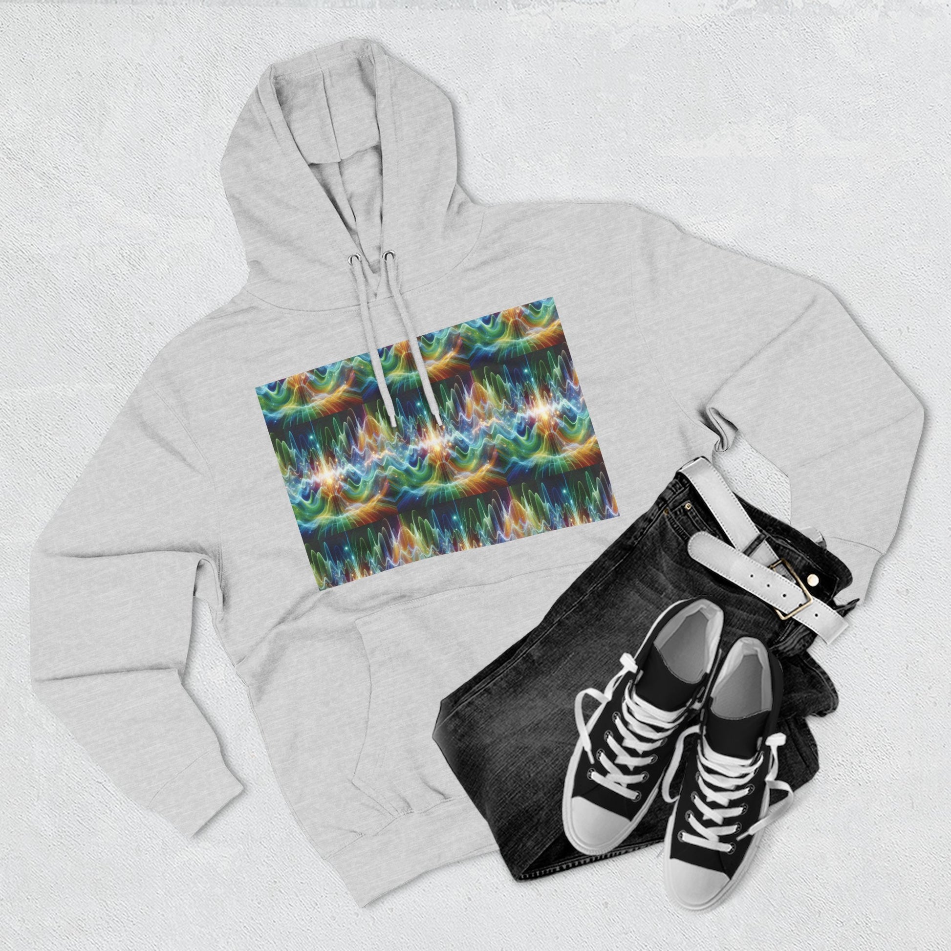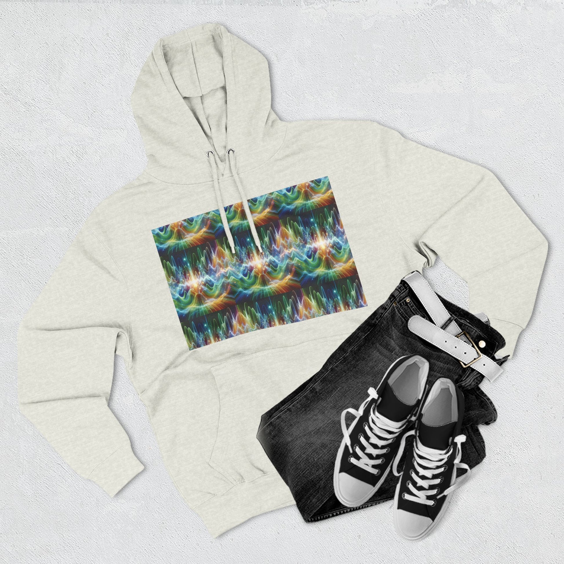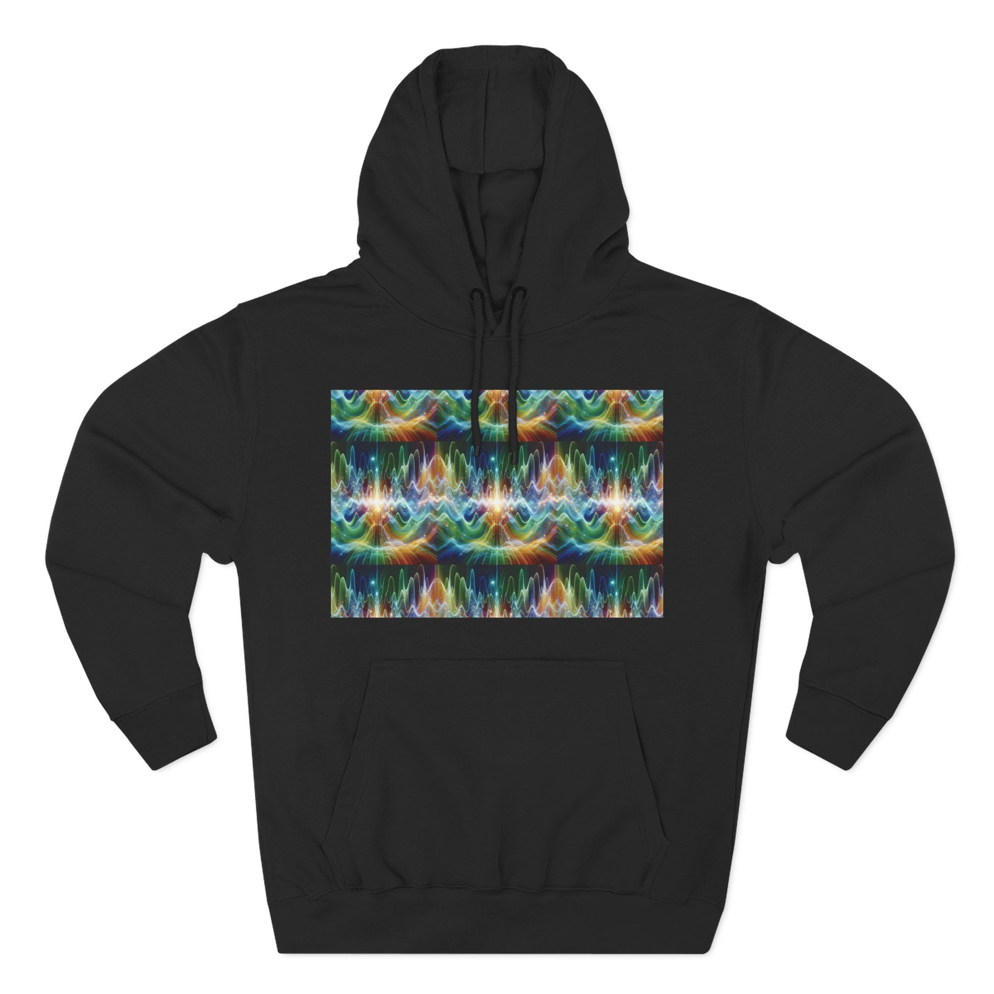 A three-panel fleece hoodie featuring a unique design of frequency waves. This cozy hoodie provides a relaxed vibe and can be a versatile addition to anyone's wardrobe. Perfect for those who appreciate comfort and style. Ideal for casual wear, lounging at home, or staying warm on chilly days.