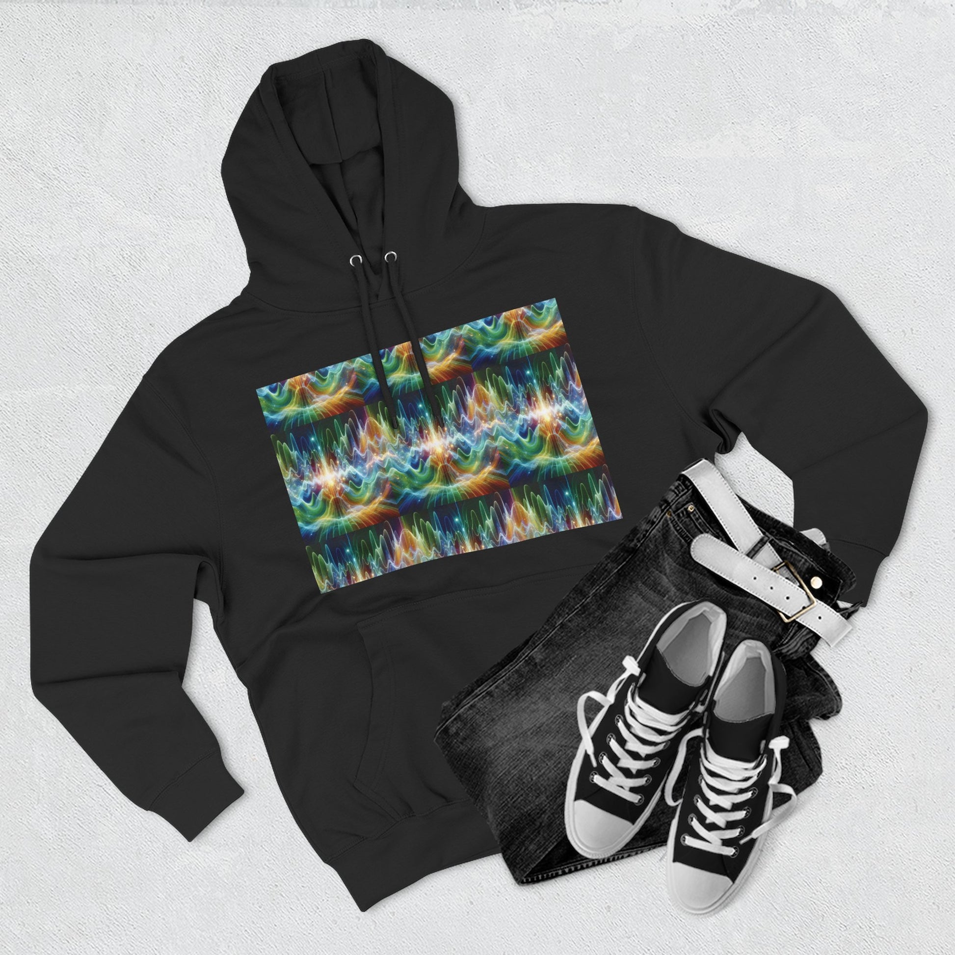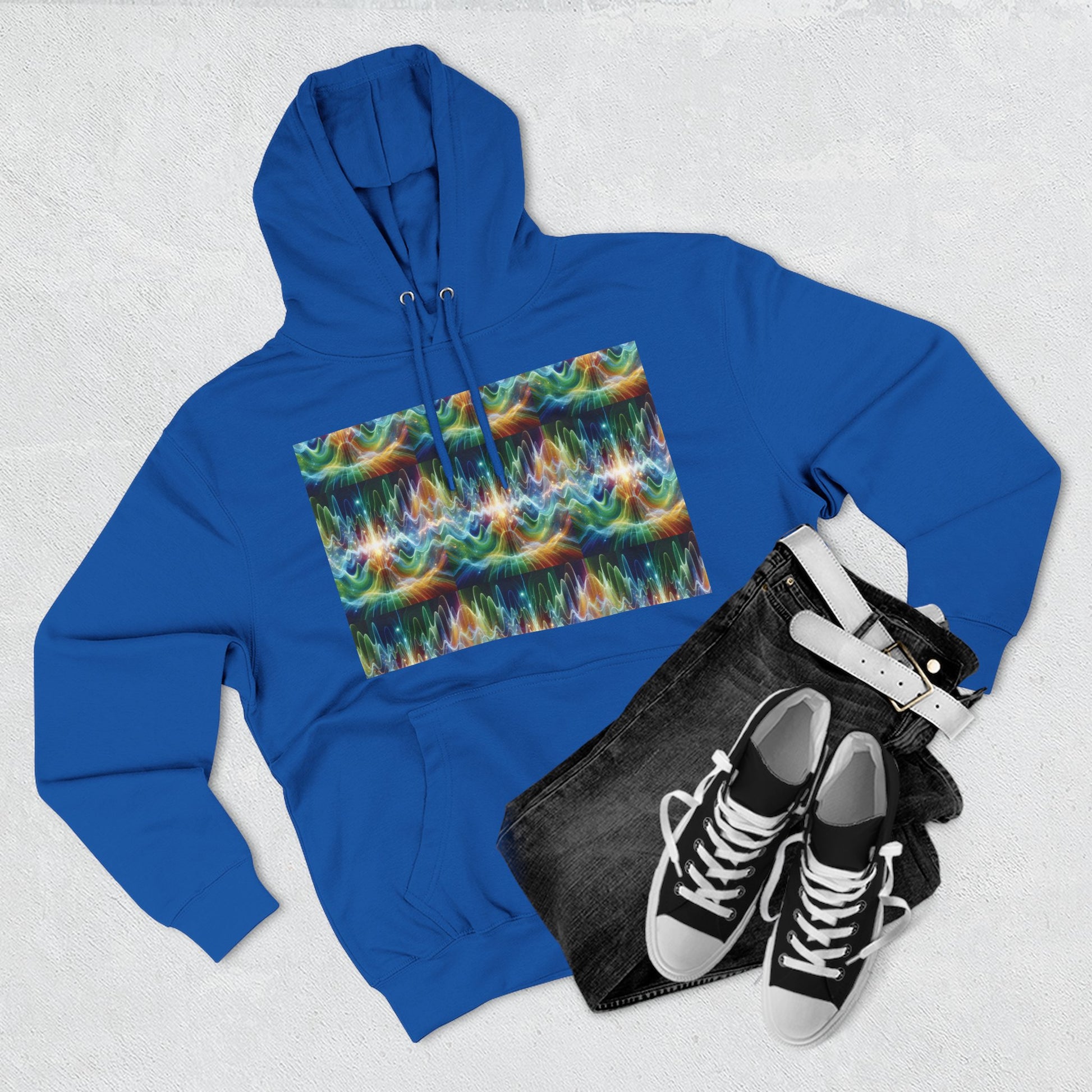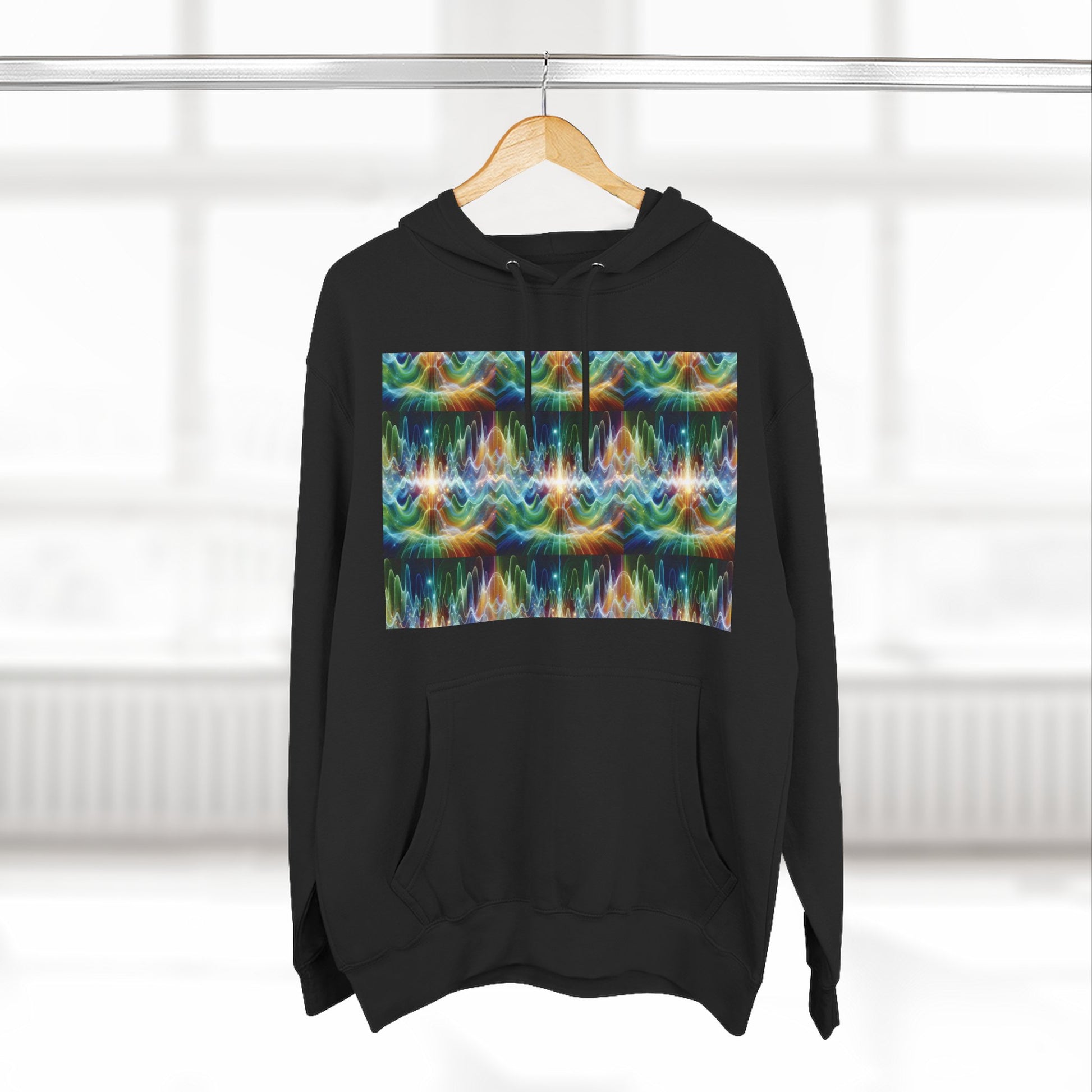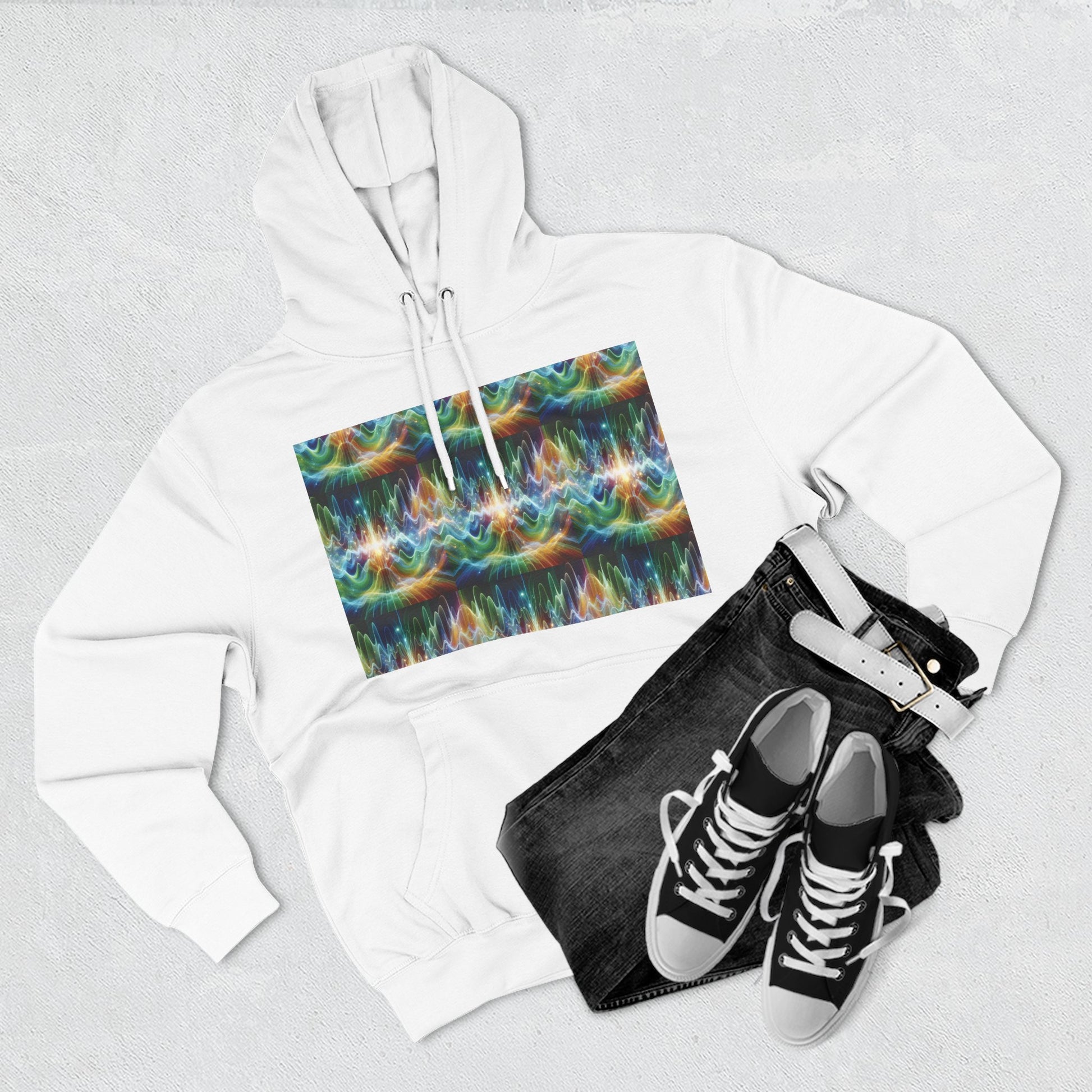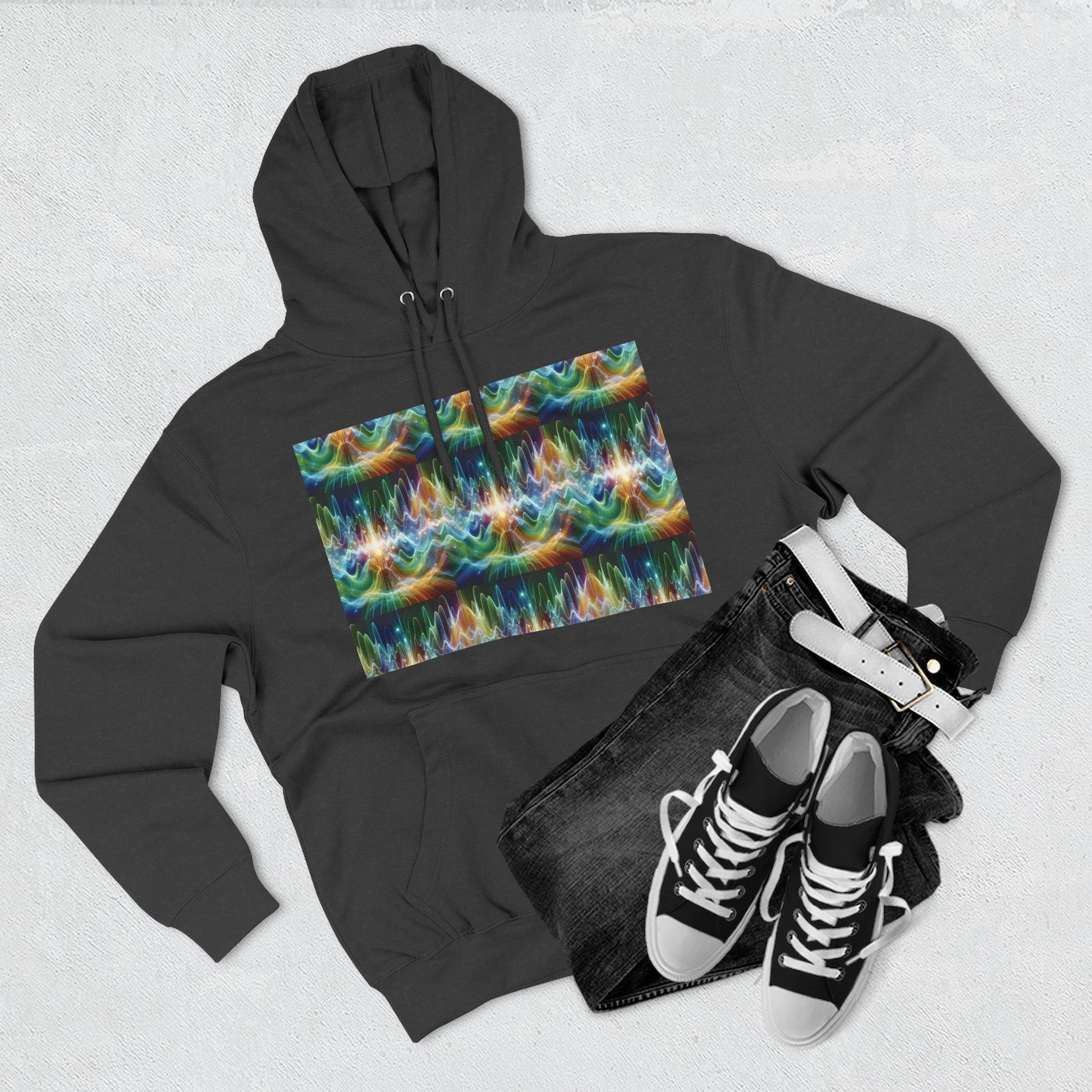 A three-panel fleece hoodie featuring a unique design of frequency waves. This cozy hoodie provides a relaxed vibe and can be a versatile addition to anyone's wardrobe. Perfect for those who appreciate comfort and style. Ideal for casual wear, lounging at home, or staying warm on chilly days.