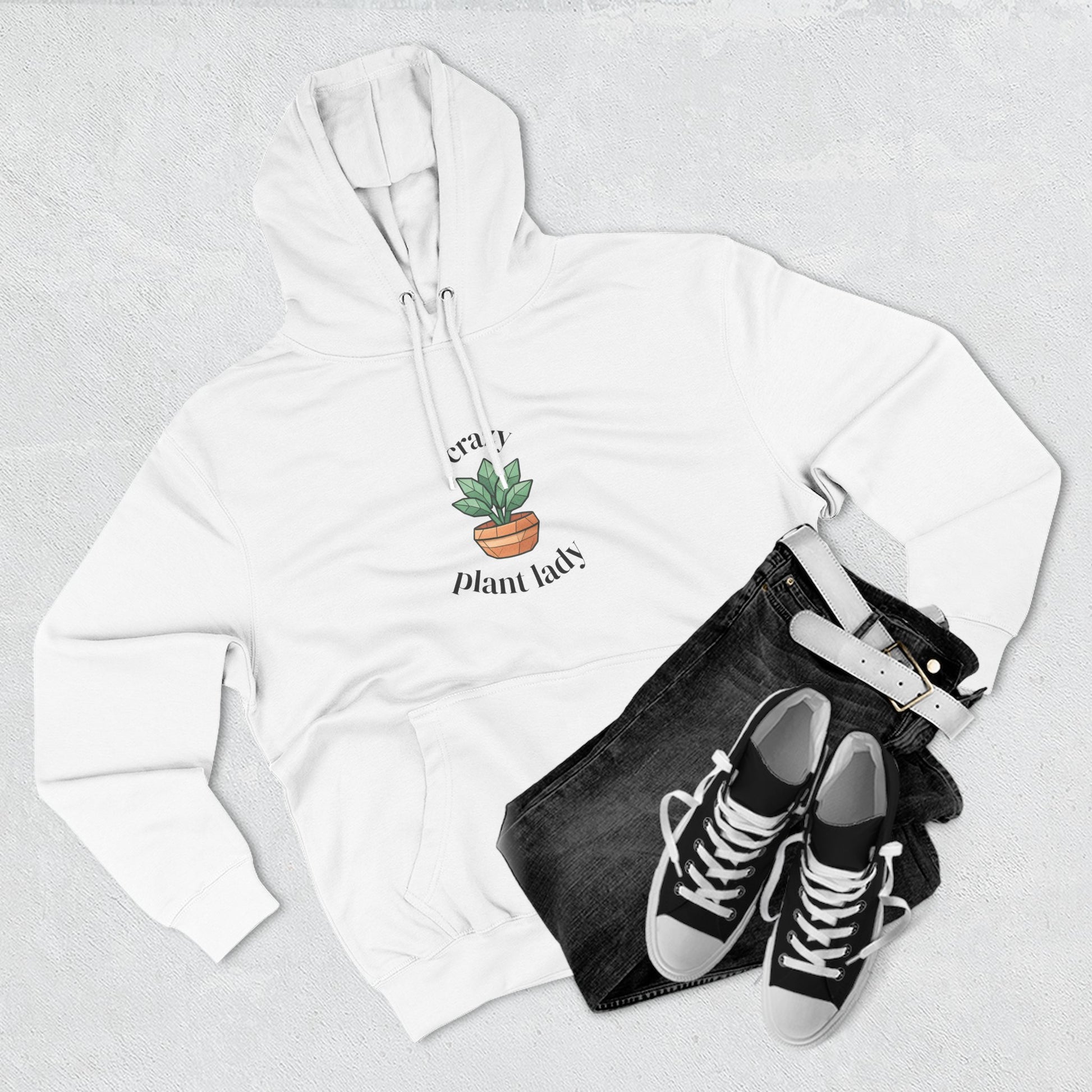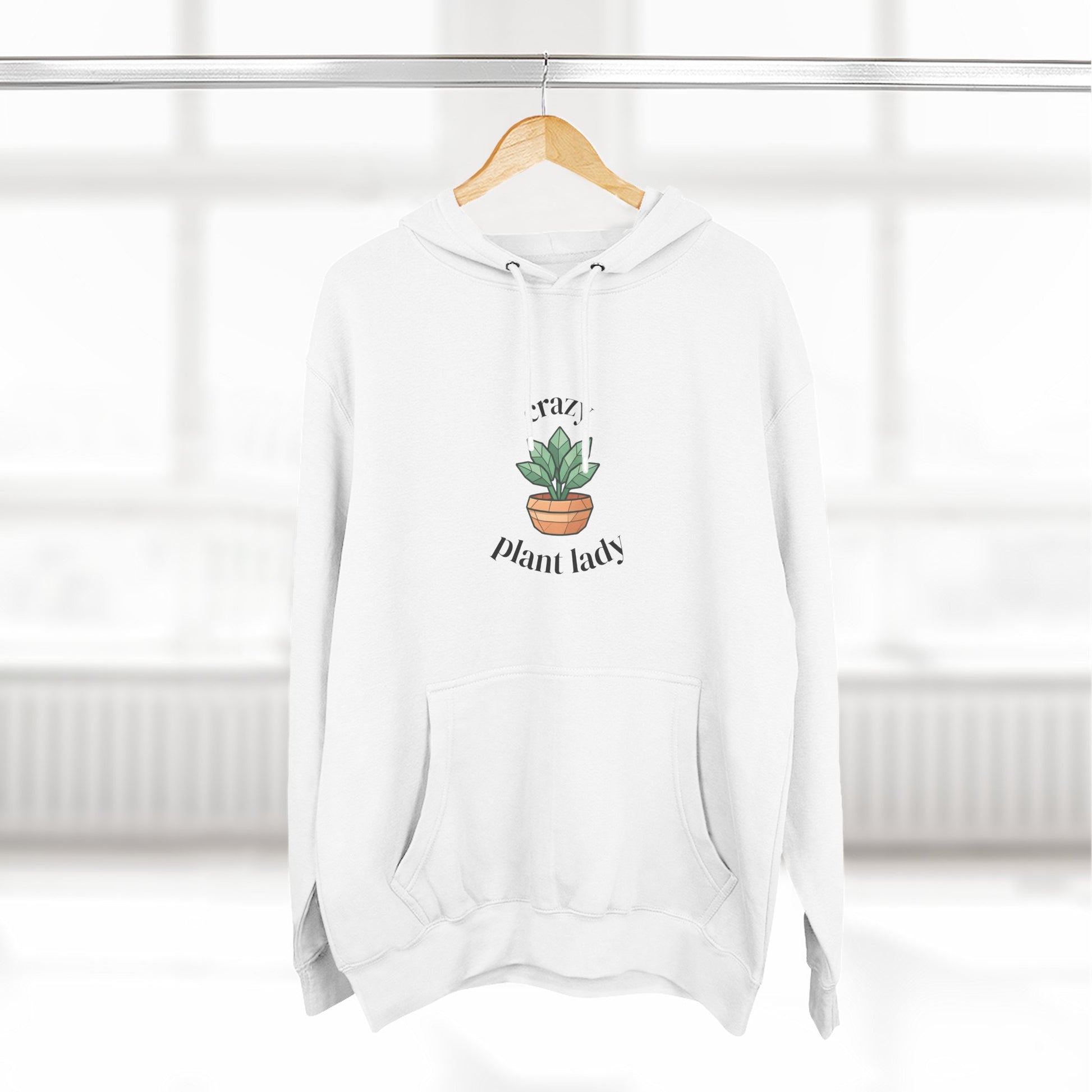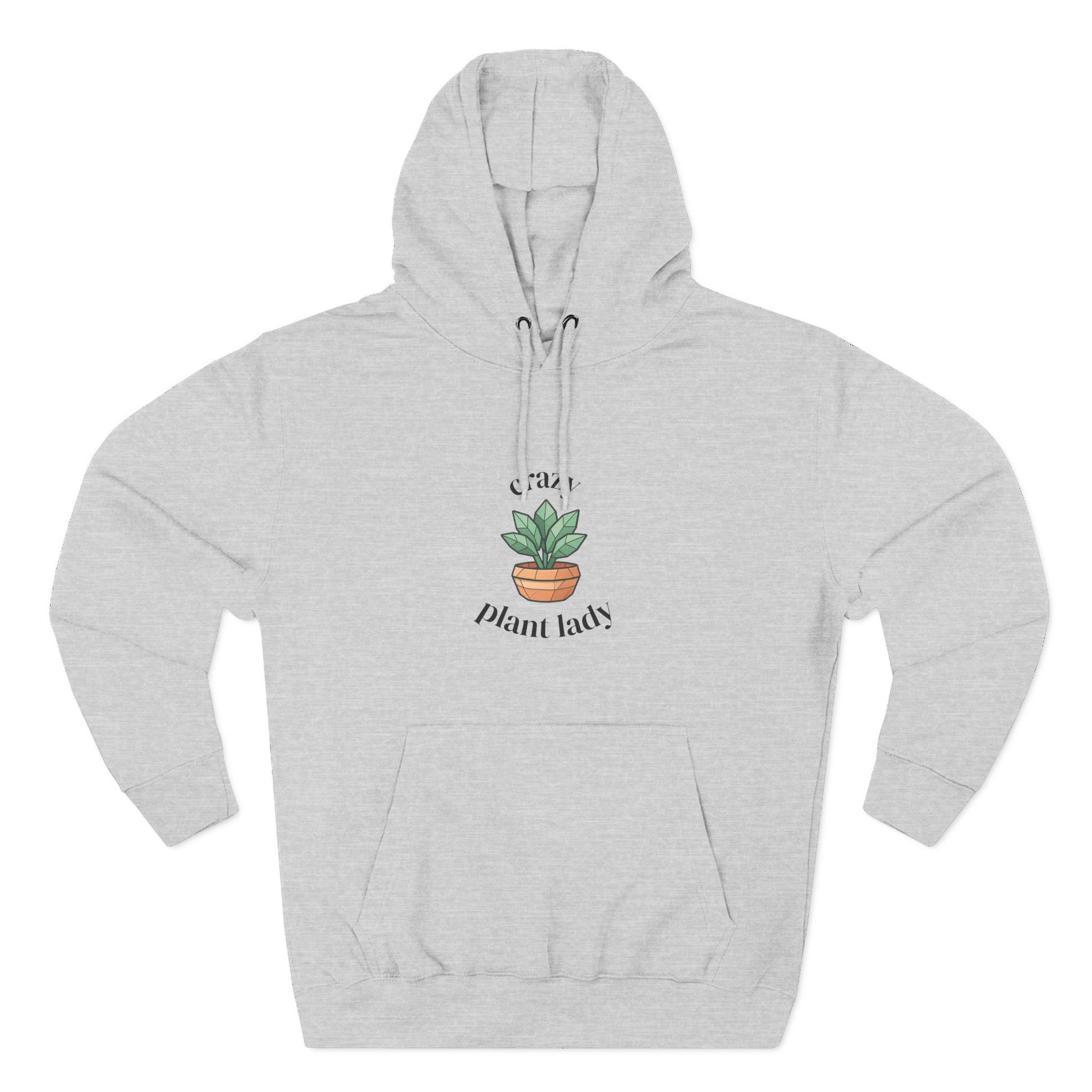 A cozy Three-Panel Fleece Hoodie featuring the 'crazy plant lady' design. Perfect for plant lovers who want to show off their love for greenery in a fun and quirky way. This hoodie provides a relaxed and casual vibe, ideal for lounging at home or running errands. Great for gifting during plant-themed occasions or just to treat yourself.