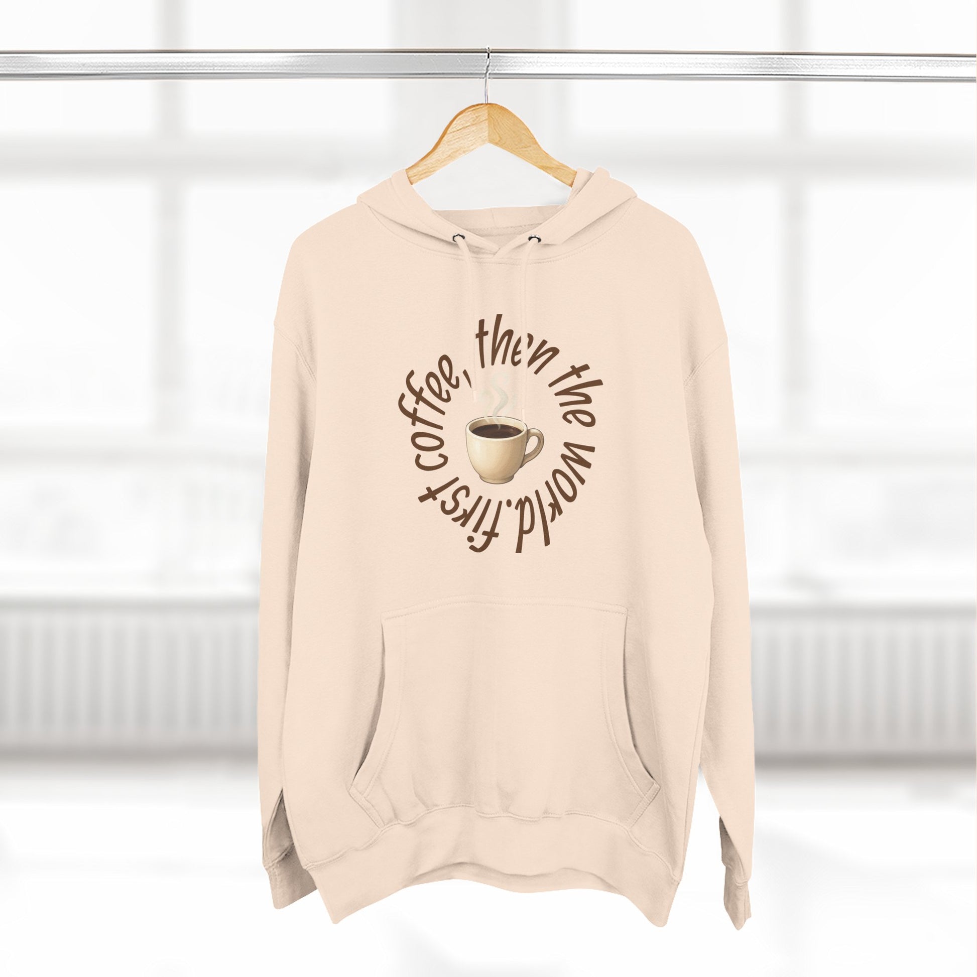 Stay cozy and stylish with this Three-Panel Fleece Hoodie featuring the phrase 'first coffee then the world'. Perfect for coffee lovers and those who seize the day. Ideal for casual days at home or out running errands. Great gift for birthdays, holidays, or just because.