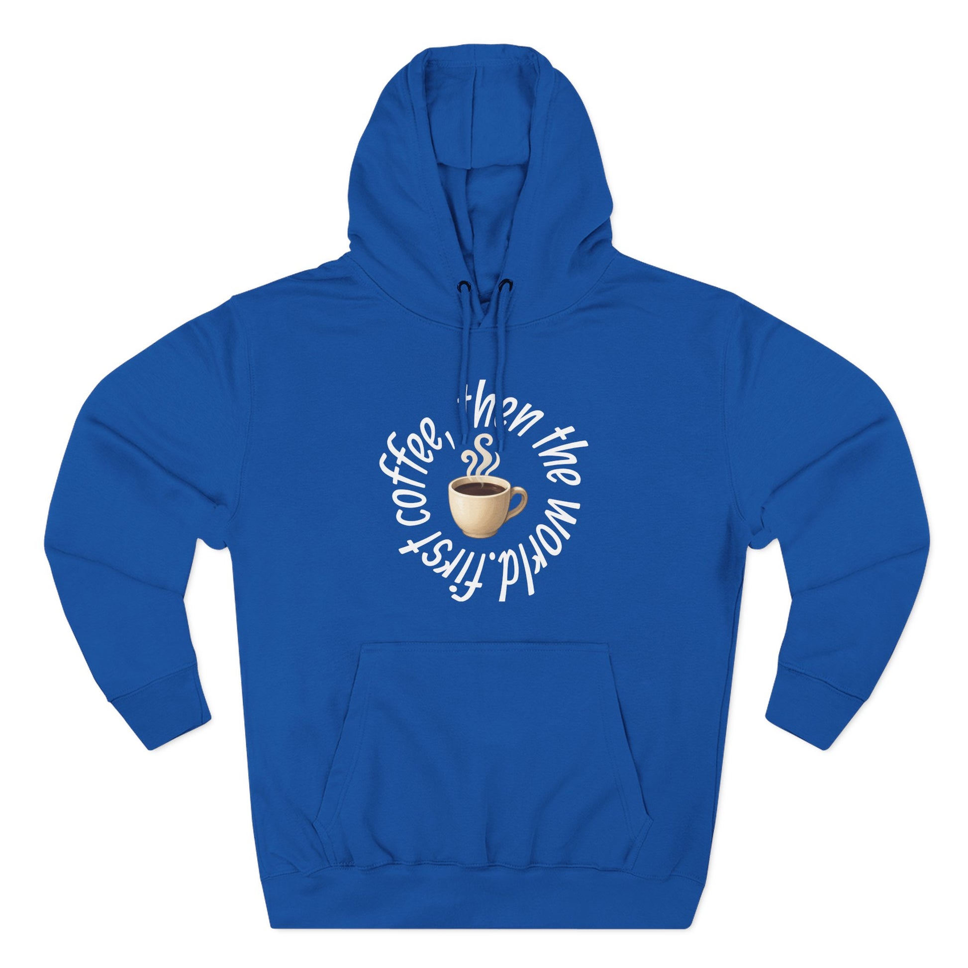 Fleece Hoodie: with 'First Coffee, Then the World' Design, Coffee Addict Sweatshirt, Cozy Winter Hoodie, Gift for Coffee Enthusiast
