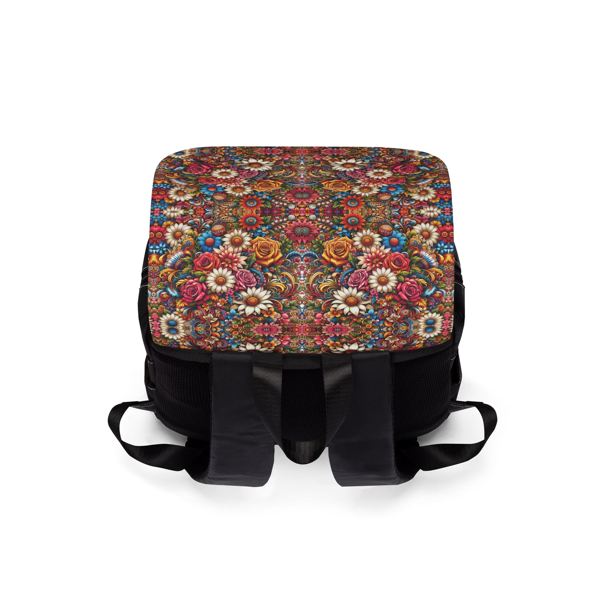 A vibrant floral patterned backpack made of 100% Oxford Canvas, featuring 6 compartments for organized storage, padded back and shoulder straps for comfort. Perfect for those who love colorful and functional accessories. Ideal for everyday use, school, and travel.