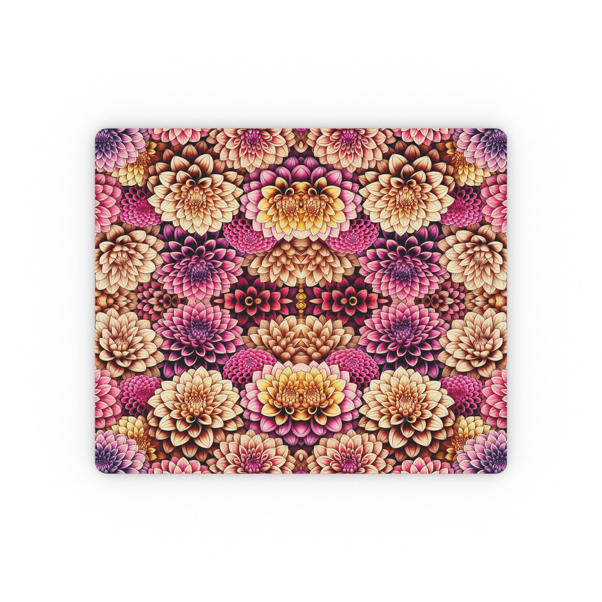 A vibrant rectangular mouse pad featuring a beautiful dahlia bloom design. Perfect for adding a pop of color to your workspace and enhancing your mouse tracking experience. Ideal for those who appreciate floral patterns and want to personalize their desk space. Relevant for birthdays, Mother's Day, or as a thoughtful gift for a coworker.