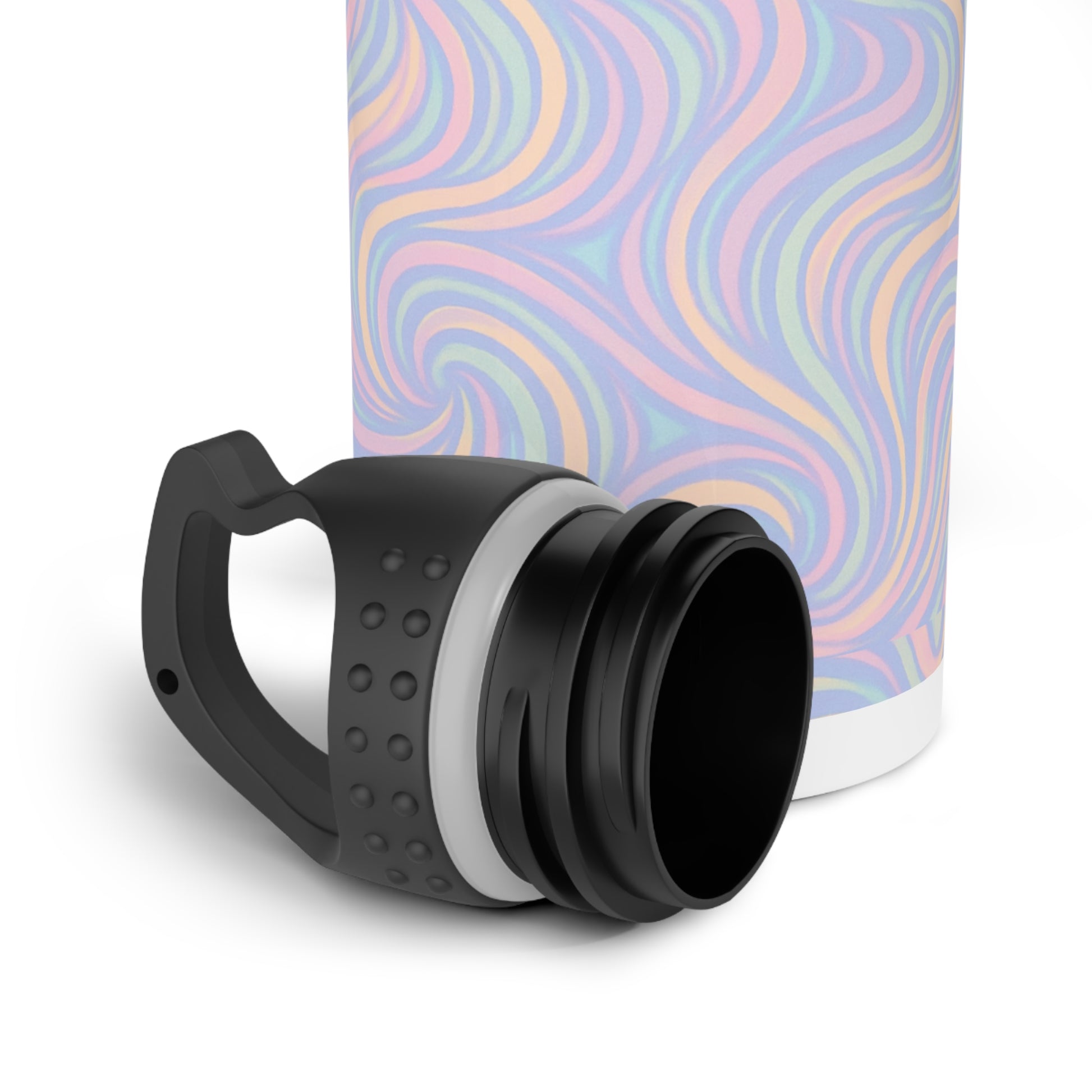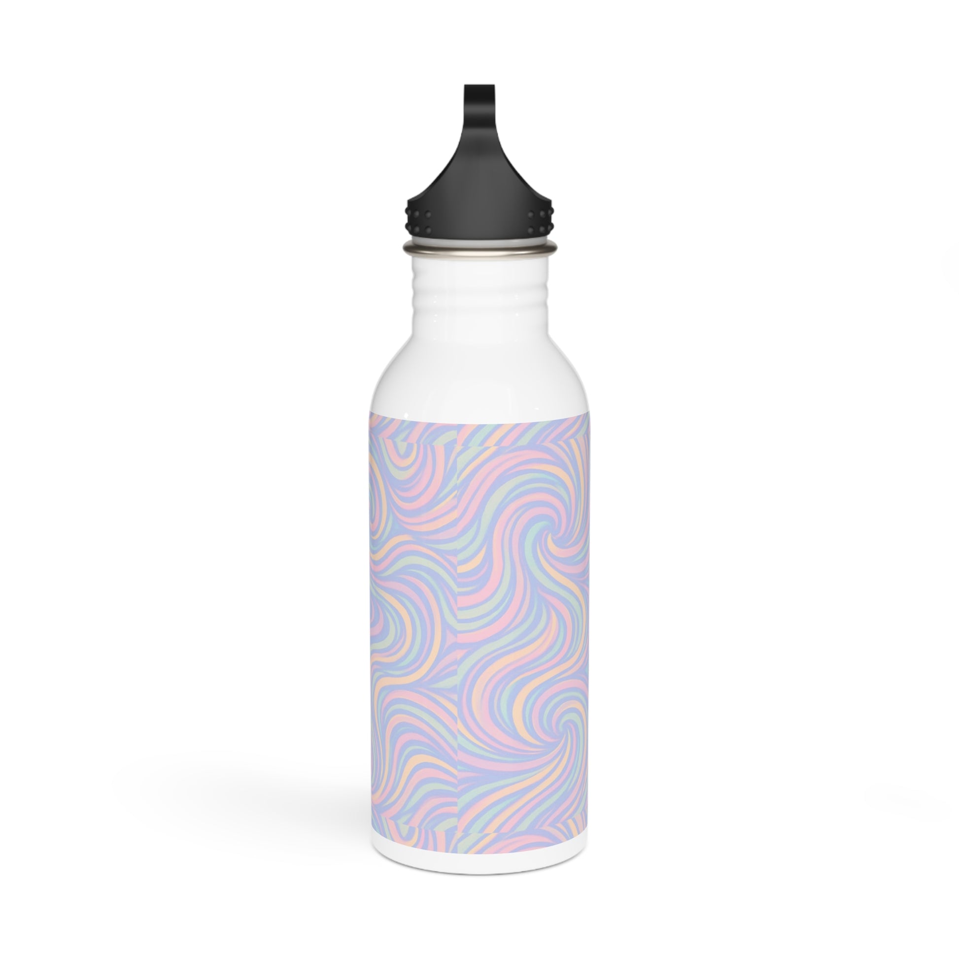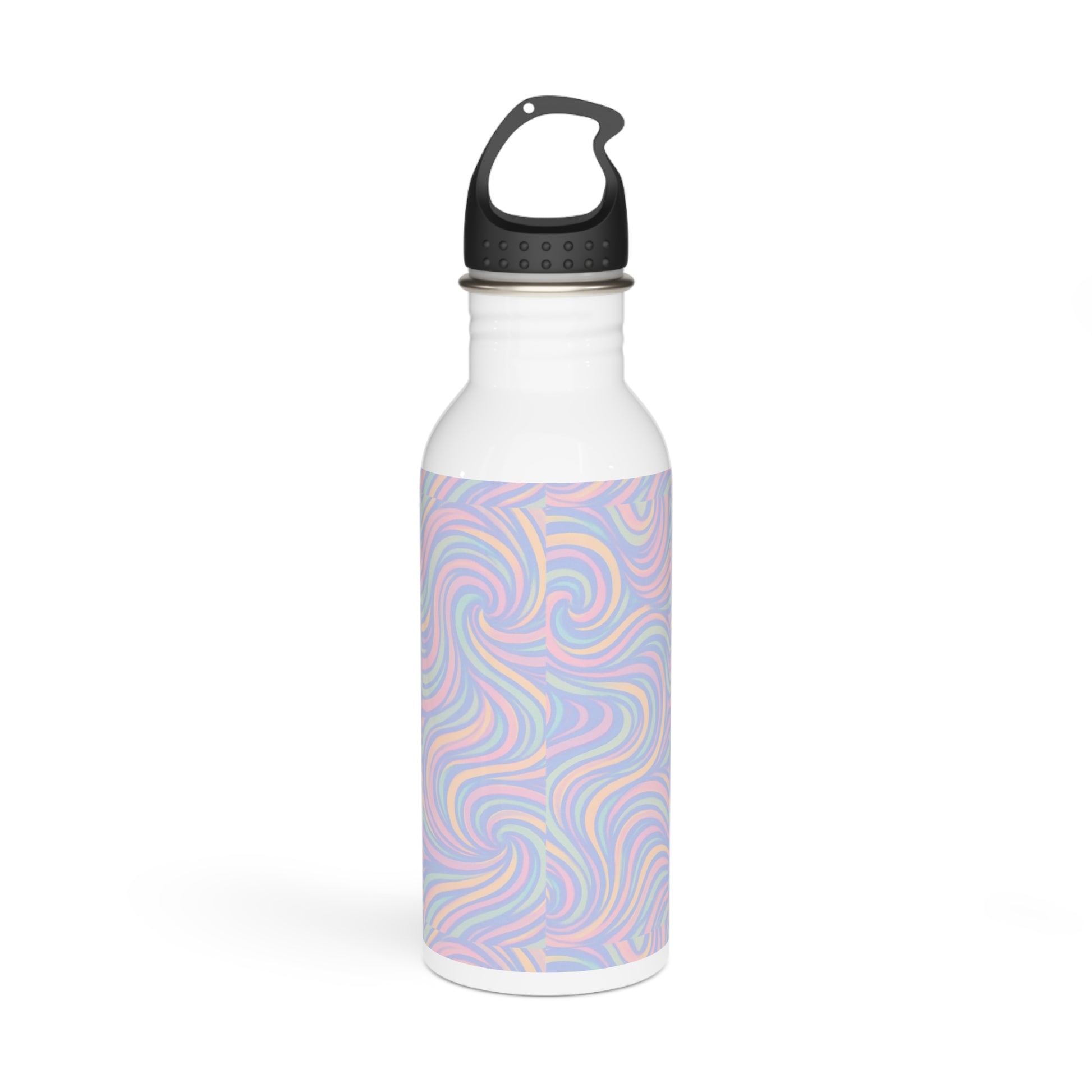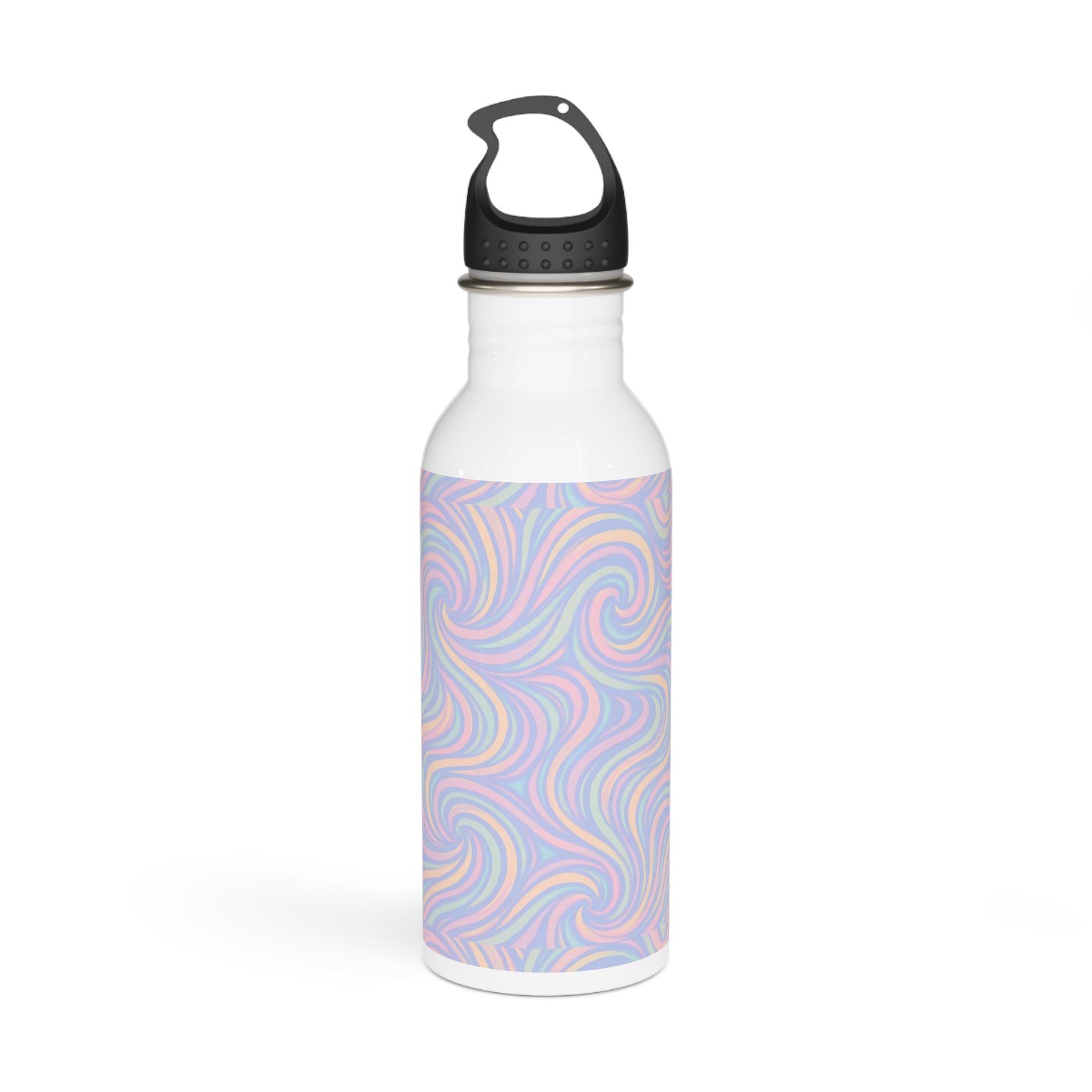 A stainless steel water bottle featuring a pastel swirl design that exudes a calming and serene vibe. Perfect for those who want to stay hydrated in style and enjoy a touch of whimsy in their everyday routine. Ideal for eco-conscious individuals, fitness enthusiasts, and nature lovers. Relevant for Earth Day, Yoga Day, or as a thoughtful gift for someone special.
