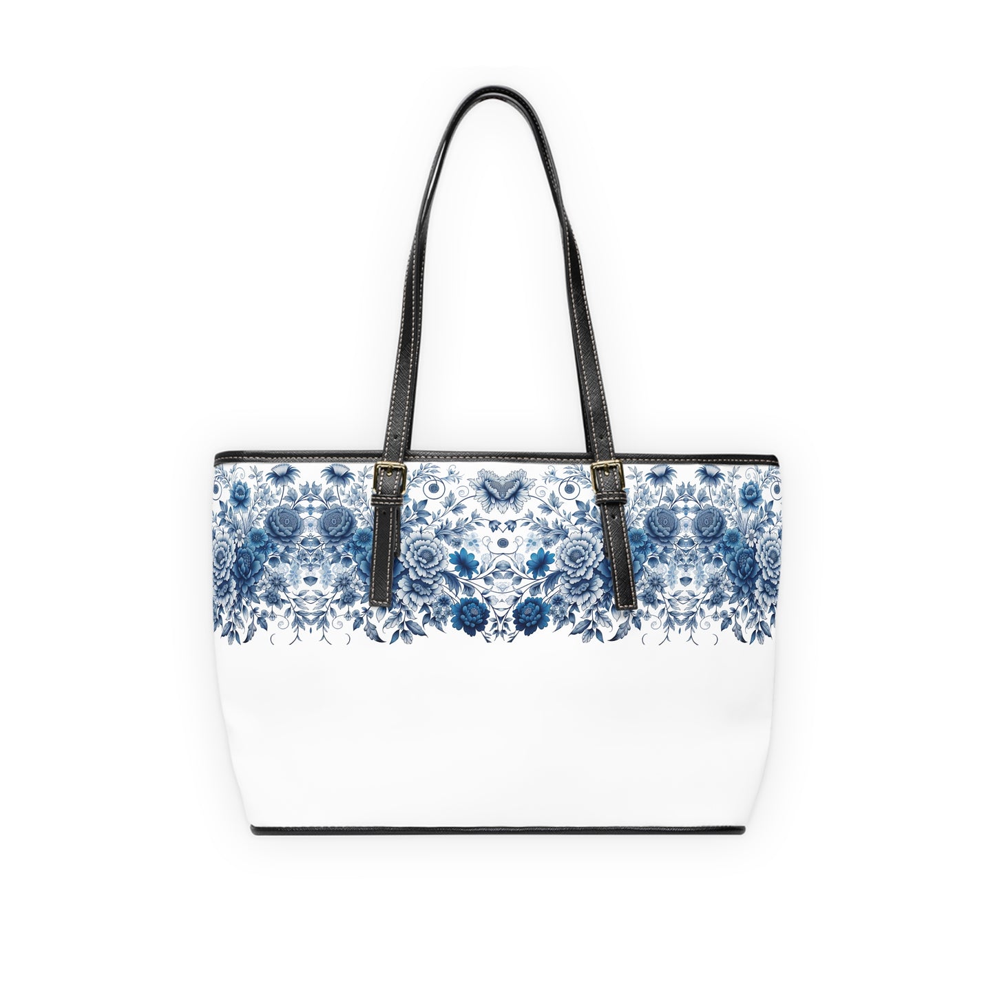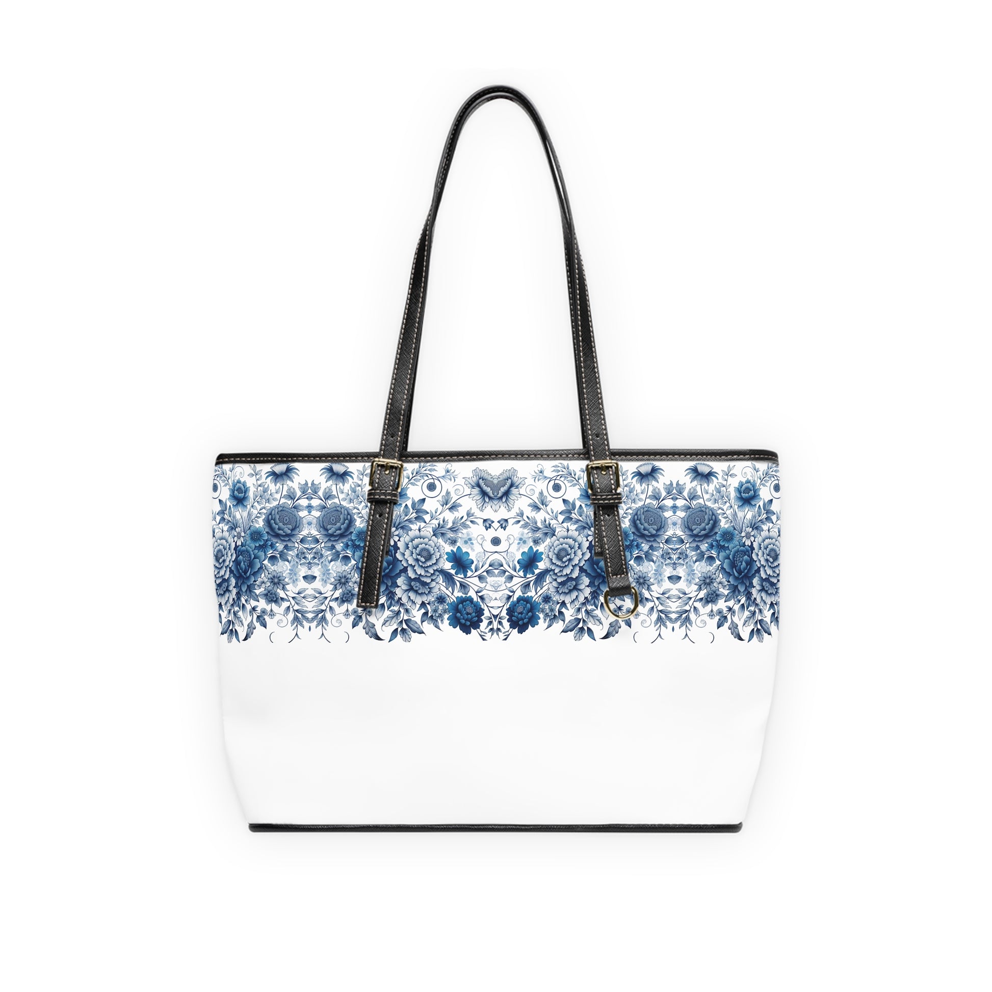 A stylish PU leather shoulder bag featuring a beautiful blue floral pattern. Perfect for adding a touch of elegance to any outfit, this bag is ideal for fashion-forward individuals looking for a versatile and chic accessory. Great for everyday use or special occasions.