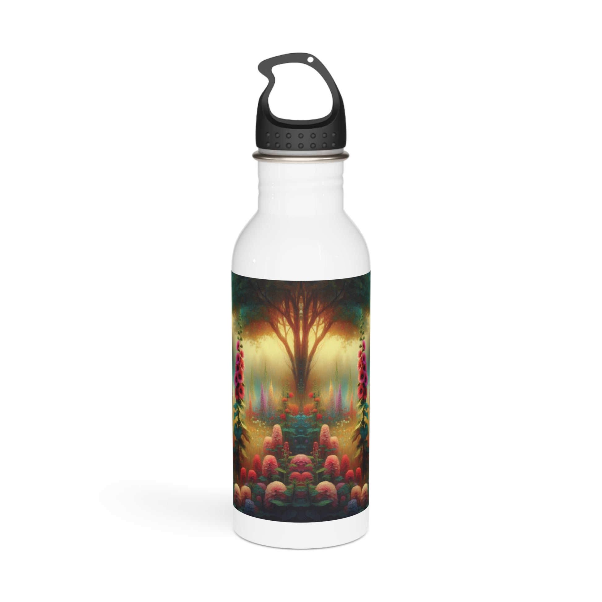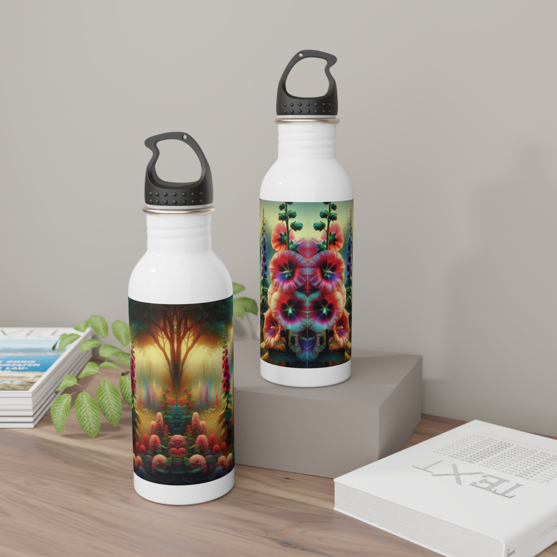 This stainless steel water bottle features a beautiful design of hollyhocks, giving off a nature-inspired and calming vibe. Perfect for outdoor enthusiasts, nature-lovers, and those who enjoy botanical designs. Great for staying hydrated on hikes, picnics, and while at work.