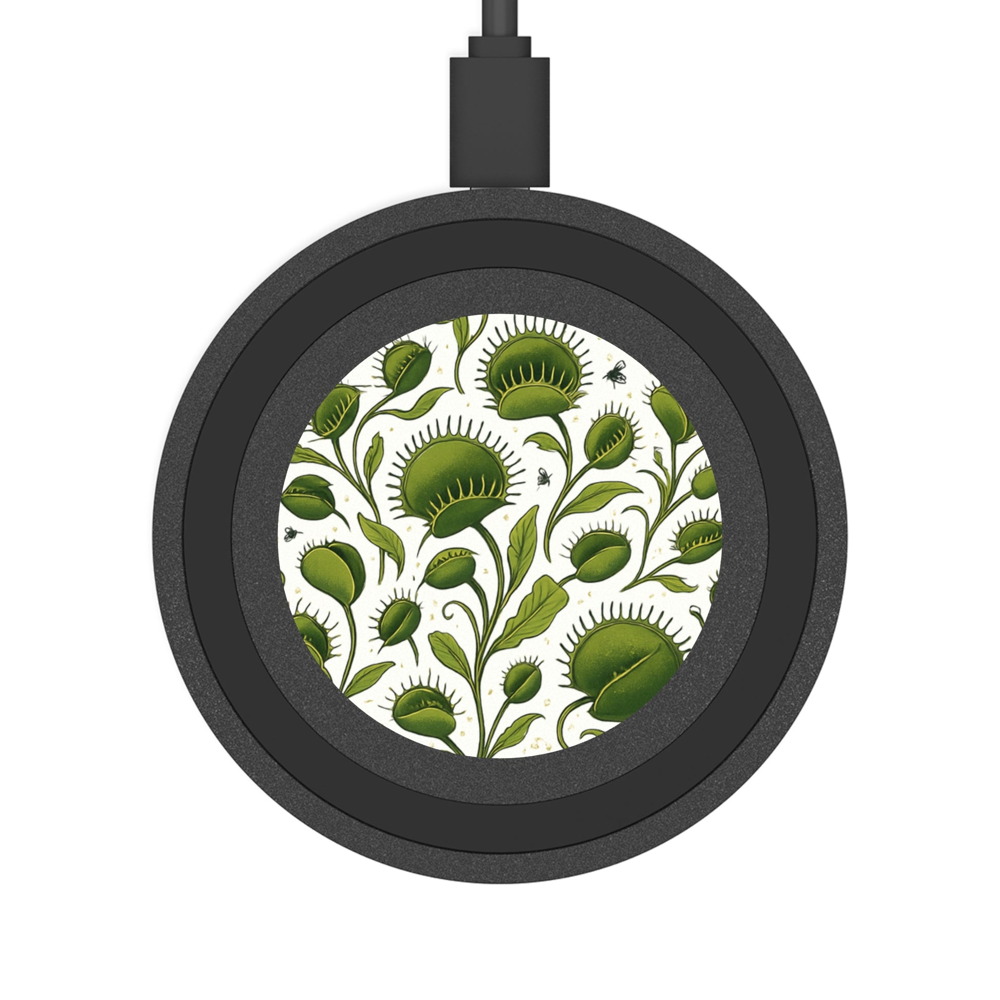 A sleek and modern wireless charging pad featuring a unique venus trap pattern. With vibrant colors and lightweight design, it is perfect for tech-savvy individuals looking to add a touch of style to their workspace or bedside table. Ideal for those who celebrate birthdays, holidays, or simply enjoy upgrading their tech accessories.